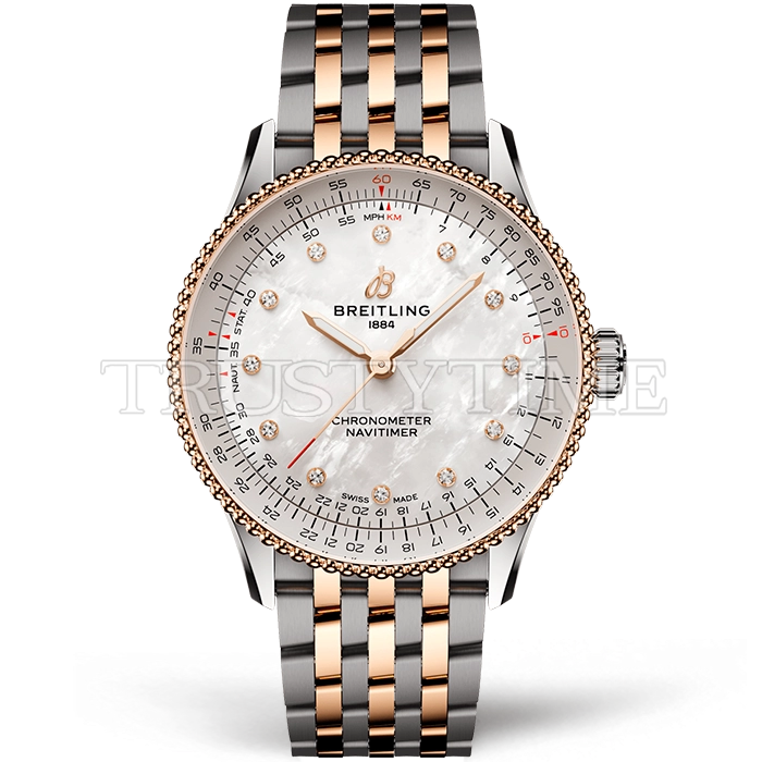 Часы Breitling из коллекции Navitimer. Классические женские часы Breitling Navitimer Automatic 35 U17327211A1U1 премиального качества (Артикул магазина: BT-1134) оснащены надежным автоматическим механизмом с автоподзаводом (работает от амплитуды движения руки) калибра Sellita SW200, в котором реализованы следующие функции: часовая, минутная и секундная стрелки, а так же максимально простой функционал без усложнений. Круглый корпус часов комбинированного сталь с розового золота цвета, имеющий размер 35 мм и высоту 10 мм превосходно дополнит образ и украсит запястье своего обладателя. Для изготовления часов Breitling Navitimer Automatic 35 U17327211A1U1 предлагаемых в нашем интернет-магазине, применяются нержавеющая сталь 316L высокого качества (Швейцарский стандарт), а так же сапфировое стекло высокой прочности, благодаря чему обеспечивается максимальная защита от сколов и механических повреждений. Отличительной чертой данной модели является перламутровый циферблат, часовые индексы которого обеспечивают камни. Завершает образ браслет из нержавеющей стали комбинированного сталь с розовым золотом цвета с фирменной раскладывающейся застежкой Breitling. Водонепроницаемость данной модели составляет 30М (WR30) – допускается минимальное воздействие с водой.