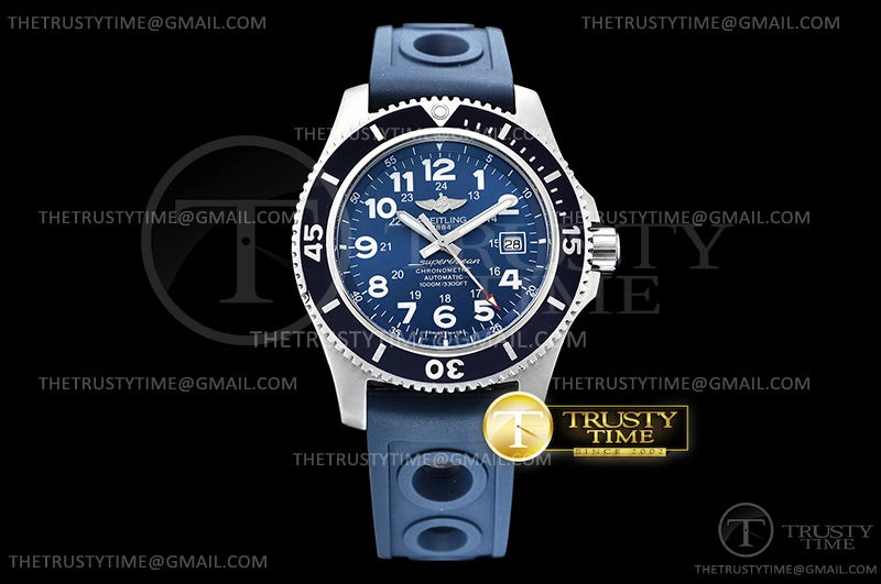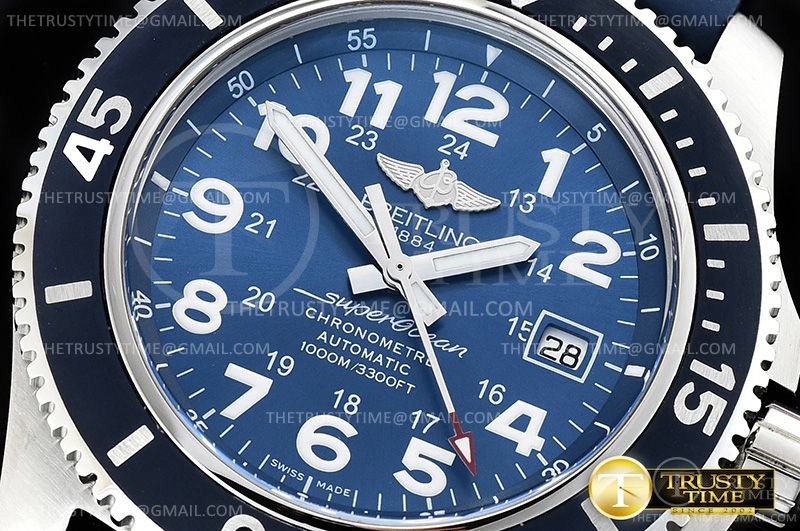 Часы Breitling из коллекции Superocean. Классические мужские часы Breitling Superocean II Gun 44 A17392D8/C910/228S/A20SS.1 премиального качества (Артикул магазина: BT-0524) оснащены надежным автоматическим механизмом с автоподзаводом (работает от амплитуды движения руки) калибра ETA2824-2, в котором реализованы следующие функции: часовая, минутная и секундная стрелки, а так же дата. Круглый корпус часов стального цвета, имеющий размер 44 мм и высоту 14.5 мм превосходно дополнит образ и украсит запястье своего обладателя. Для изготовления часов Breitling Superocean II Gun 44 A17392D8/C910/228S/A20SS.1 предлагаемых в нашем интернет-магазине, применяются нержавеющая сталь 316F высокого качества (Швейцарский стандарт), а так же сапфировое стекло высокой прочности, благодаря чему обеспечивается максимальная защита от сколов и механических повреждений. Отличительной чертой данной модели является синий циферблат, часовые индексы которого обеспечивают арабские цифры. Завершает образ каучуковый ремешок синего цвета с фирменной классической застежкой Breitling. Водонепроницаемость данной модели составляет 30М (WR30) – допускается минимальное воздействие с водой.