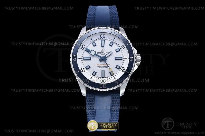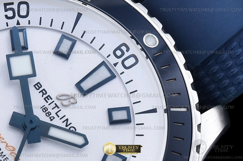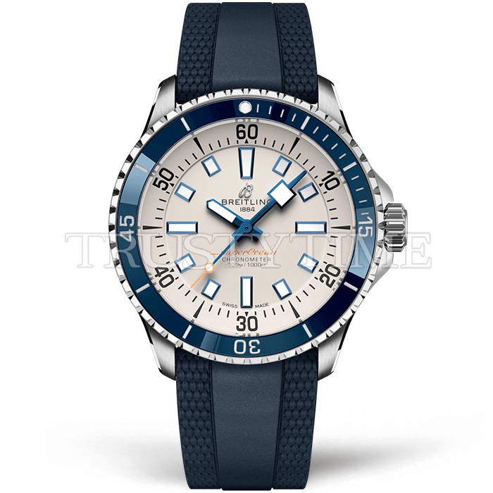 Часы Breitling из коллекции Superocean. Спортивные мужские часы Breitling Superocean Automatic 42mm A17375E71G1S1 премиального качества (Артикул магазина: BT-1060) оснащены надежным автоматическим механизмом с автоподзаводом (работает от амплитуды движения руки) калибра ETA2824-2, в котором реализованы следующие функции: часовая, минутная и секундная стрелки, а так же максимально простой функционал без усложнений. Круглый корпус часов стального цвета, имеющий размер 42 мм и высоту 13 мм превосходно дополнит образ и украсит запястье своего обладателя. Для изготовления часов Breitling Superocean Automatic 42mm A17375E71G1S1 предлагаемых в нашем интернет-магазине, применяются нержавеющая сталь 316L высокого качества (Швейцарский стандарт), а так же сапфировое стекло высокой прочности, благодаря чему обеспечивается максимальная защита от сколов и механических повреждений. Отличительной чертой данной модели является белый циферблат, часовые индексы которого обеспечивают часовые метки. Завершает образ каучуковый ремешок синего цвета с фирменной раскладывающейся застежкой Breitling. Водонепроницаемость данной модели составляет 30М (WR30) – допускается минимальное воздействие с водой.