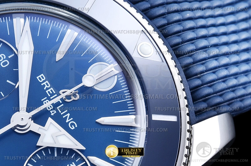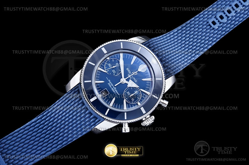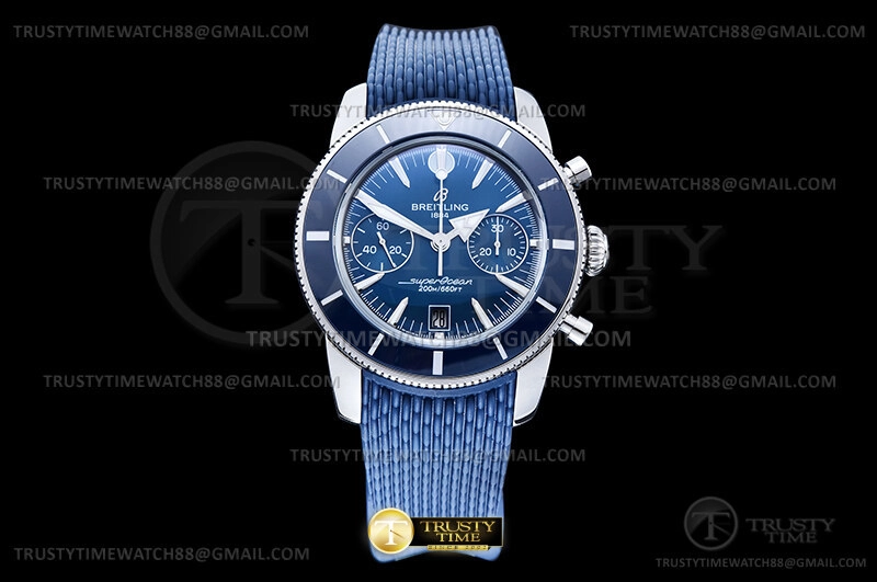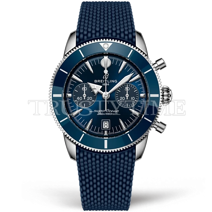 Часы Breitling из коллекции Superocean Heritage B01 Chronograph. Спортивные мужские часы Breitling Superocean Heritage B01 Chronograph 42 AB0156161C1S1 премиального качества (Артикул магазина: BT-1178) оснащены надежным автоматическим механизмом с автоподзаводом (работает от амплитуды движения руки) калибра Valjoux-7750, в котором реализованы следующие функции: часовая, минутная и секундная стрелки, а так же хронограф, дата. Круглый корпус часов стального цвета, имеющий размер 42 мм и высоту 18.5 мм превосходно дополнит образ и украсит запястье своего обладателя. Для изготовления часов Breitling Superocean Heritage B01 Chronograph 42 AB0156161C1S1 предлагаемых в нашем интернет-магазине, применяются нержавеющая сталь 316F высокого качества (Швейцарский стандарт), а так же сапфировое стекло высокой прочности, благодаря чему обеспечивается максимальная защита от сколов и механических повреждений. Отличительной чертой данной модели является синий циферблат, часовые индексы которого обеспечивают часовые метки. Завершает образ каучуковый ремешок синего цвета с фирменной раскладывающейся застежкой Breitling. Водонепроницаемость данной модели составляет 30М (WR30) – допускается минимальное воздействие с водой.