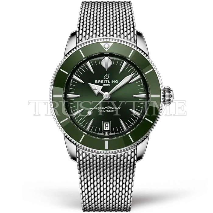 Часы Breitling из коллекции Superocean Heritage B31. Спортивные мужские часы Breitling Superocean Heritage B31 Automatic 42 AB3111361L1A1 премиального качества (Артикул магазина: BT-1191) оснащены надежным автоматическим механизмом с автоподзаводом (работает от амплитуды движения руки) калибра ETA2824-2, в котором реализованы следующие функции: часовая, минутная и секундная стрелки, а так же дата. Круглый корпус часов стального цвета, имеющий размер 42 мм и высоту 16.5 мм превосходно дополнит образ и украсит запястье своего обладателя. Для изготовления часов Breitling Superocean Heritage B31 Automatic 42 AB3111361L1A1 предлагаемых в нашем интернет-магазине, применяются нержавеющая сталь 316F высокого качества (Швейцарский стандарт), а так же сапфировое стекло высокой прочности, благодаря чему обеспечивается максимальная защита от сколов и механических повреждений. Отличительной чертой данной модели является зеленый циферблат, часовые индексы которого обеспечивают часовые метки. Завершает образ каучуковый ремешок зеленого цвета с фирменной раскладывающейся застежкой Breitling. Водонепроницаемость данной модели составляет 30М (WR30) – допускается минимальное воздействие с водой.