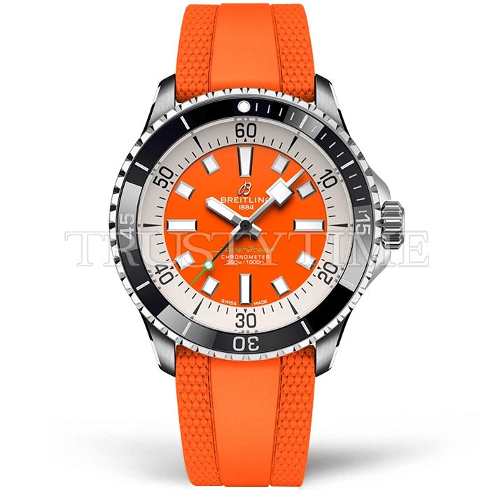 Часы Breitling из коллекции Superocean. Спортивные мужские часы Breitling Superocean Automatic 42mm Kelly Slater A173751A1O1S1 премиального качества (Артикул магазина: BT-1127) оснащены надежным автоматическим механизмом с автоподзаводом (работает от амплитуды движения руки) калибра ETA2824-2, в котором реализованы следующие функции: часовая, минутная и секундная стрелки, а так же максимально простой функционал без усложнений. Круглый корпус часов стального цвета, имеющий размер 42 мм и высоту 13 мм превосходно дополнит образ и украсит запястье своего обладателя. Для изготовления часов Breitling Superocean Automatic 42mm Kelly Slater A173751A1O1S1 предлагаемых в нашем интернет-магазине, применяются нержавеющая сталь 316L высокого качества (Швейцарский стандарт), а так же сапфировое стекло высокой прочности, благодаря чему обеспечивается максимальная защита от сколов и механических повреждений. Отличительной чертой данной модели является оранжевый циферблат, часовые индексы которого обеспечивают часовые метки. Завершает образ каучуковый ремешок оранжевого цвета с фирменной раскладывающейся застежкой Breitling. Водонепроницаемость данной модели составляет 30М (WR30) – допускается минимальное воздействие с водой.