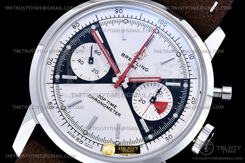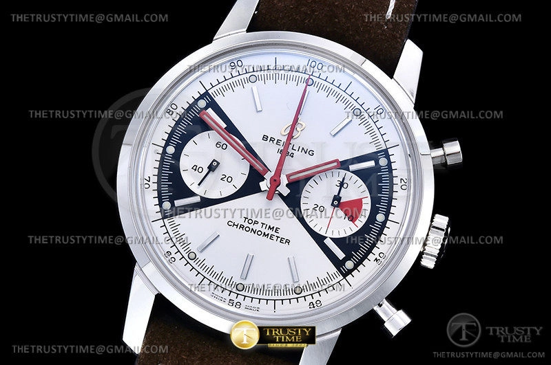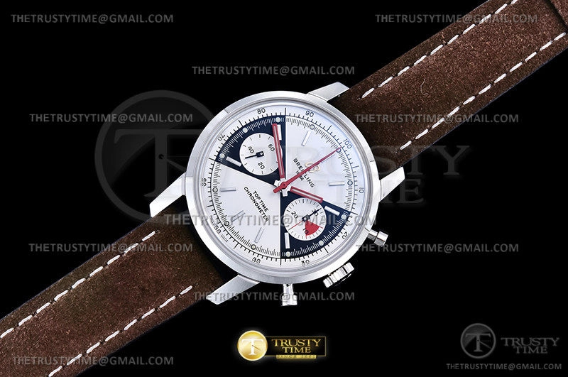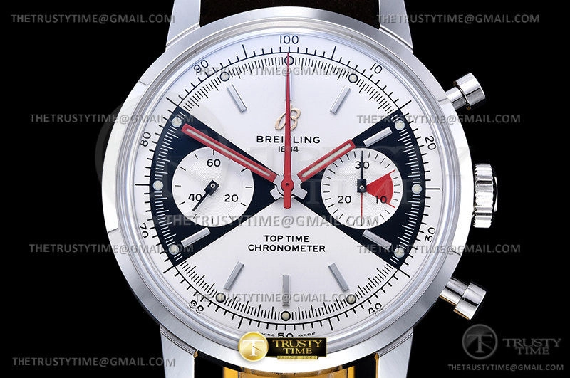 Часы Breitling из коллекции Top Time. Спортивные мужские часы Breitling Top Time Chronograph 41 A23310121G1X1 премиального качества (Артикул магазина: BT-0565) оснащены надежным автоматическим механизмом с автоподзаводом (работает от амплитуды движения руки) калибра Valjoux-7750, в котором реализованы следующие функции: часовая, минутная и секундная стрелки, а так же хронограф. Круглый корпус часов стального цвета, имеющий размер 41 мм и высоту 17 мм превосходно дополнит образ и украсит запястье своего обладателя. Для изготовления часов Breitling Top Time Chronograph 41 A23310121G1X1 предлагаемых в нашем интернет-магазине, применяются нержавеющая сталь 316F высокого качества (Швейцарский стандарт), а так же сапфировое стекло высокой прочности, благодаря чему обеспечивается максимальная защита от сколов и механических повреждений. Отличительной чертой данной модели является белый циферблат, часовые индексы которого обеспечивают часовые метки. Завершает образ кожаный ремешок коричневого цвета с фирменной классической застежкой Breitling. Водонепроницаемость данной модели составляет 30М (WR30) – допускается минимальное воздействие с водой.
