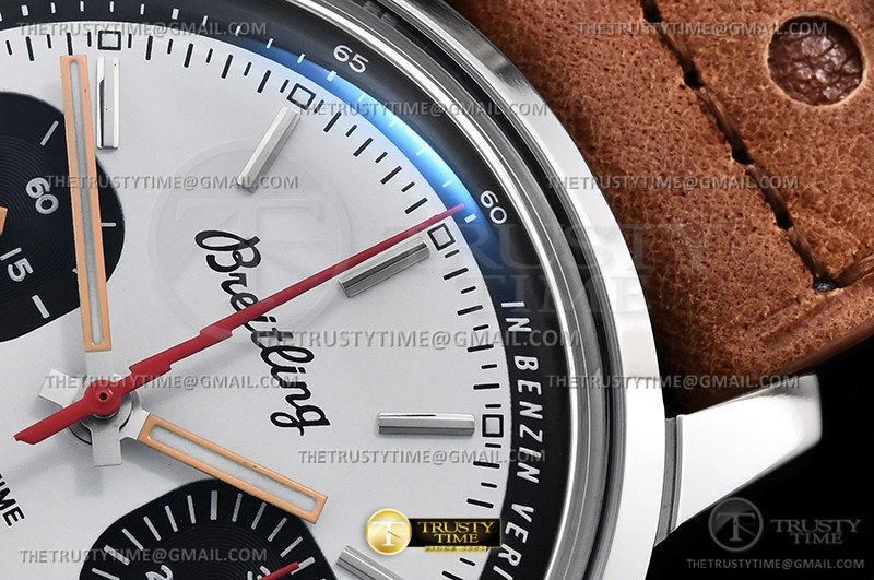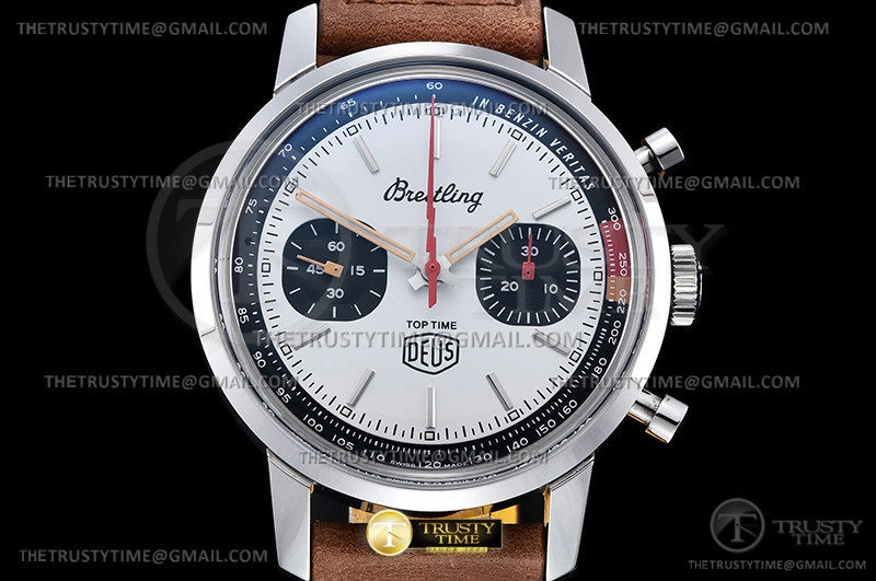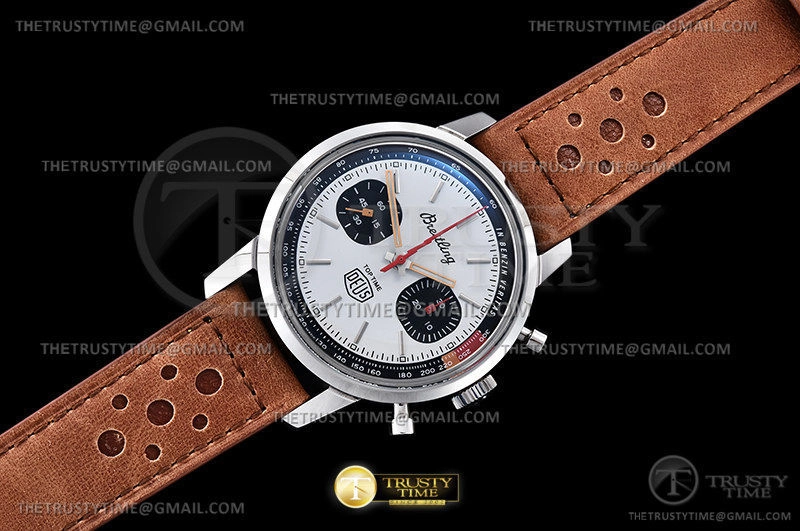 Часы Breitling из коллекции Top Time. Спортивные мужские часы Breitling Top Time Dues Chronograph 41 A233101A1A1X1 премиального качества (Артикул магазина: BT-0604) оснащены надежным автоматическим механизмом с автоподзаводом (работает от амплитуды движения руки) калибра Valjoux-7750, в котором реализованы следующие функции: часовая, минутная и секундная стрелки, а так же хронограф. Круглый корпус часов стального цвета, имеющий размер 41 мм и высоту 14.2 мм превосходно дополнит образ и украсит запястье своего обладателя. Для изготовления часов Breitling Top Time Dues Chronograph 41 A233101A1A1X1 предлагаемых в нашем интернет-магазине, применяются нержавеющая сталь 316F высокого качества (Швейцарский стандарт), а так же сапфировое стекло высокой прочности, благодаря чему обеспечивается максимальная защита от сколов и механических повреждений. Отличительной чертой данной модели является белый циферблат, часовые индексы которого обеспечивают часовые метки. Завершает образ кожаный ремешок коричневого цвета с фирменной классической застежкой Breitling. Водонепроницаемость данной модели составляет 30М (WR30) – допускается минимальное воздействие с водой.
