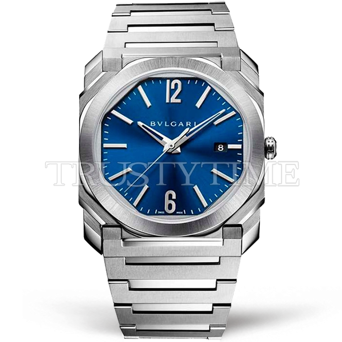 Часы Bvlgari из коллекции Octo Finissimo. Классические женские часы Bvlgari Octo Finissimo Automatic премиального качества (Артикул магазина: BV-0666) оснащены надежным автоматическим механизмом с автоподзаводом (работает от амплитуды движения руки) калибра BVL138, в котором реализованы следующие функции: часовая, минутная и секундная стрелки, а так же хронограф, дата. Восьмиугольный корпус часов стального цвета, имеющий размер 38 мм и высоту 11 мм превосходно дополнит образ и украсит запястье своего обладателя. Для изготовления часов Bvlgari Octo Finissimo Automatic предлагаемых в нашем интернет-магазине, применяются нержавеющая сталь 316L высокого качества (Швейцарский стандарт), а так же сапфировое стекло высокой прочности, благодаря чему обеспечивается максимальная защита от сколов и механических повреждений. Отличительной чертой данной модели является синий циферблат, часовые индексы которого обеспечивают часовые метки. Завершает образ браслет из нержавеющей стали стального цвета с фирменной раскладывающейся застежкой Bvlgari. Водонепроницаемость данной модели составляет 30М (WR30) – допускается минимальное воздействие с водой.