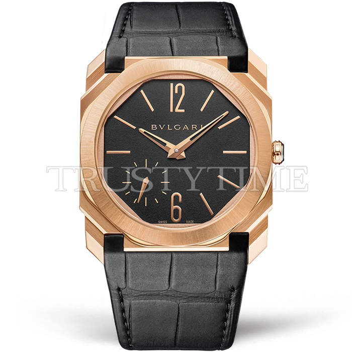 Часы Bvlgari из коллекции Octo Finissimo. Классические мужские часы Bvlgari Octo Finissimo 102371 премиального качества (Артикул магазина: BV-0716) оснащены надежным автоматическим механизмом с автоподзаводом (работает от амплитуды движения руки) калибра BVL138, в котором реализованы следующие функции: часовая, минутная и секундная стрелки, а так же максимально простой функционал без усложнений. Восьмиугольный корпус часов розового цвета, имеющий размер 40 мм и высоту 12 мм превосходно дополнит образ и украсит запястье своего обладателя. Для изготовления часов Bvlgari Octo Finissimo 102371 предлагаемых в нашем интернет-магазине, применяются нержавеющая сталь 316L высокого качества (Швейцарский стандарт), а так же сапфировое стекло высокой прочности, благодаря чему обеспечивается максимальная защита от сколов и механических повреждений. Отличительной чертой данной модели является черный циферблат, часовые индексы которого обеспечивают часовые метки. Завершает образ кожаный ремешок черного цвета с фирменной раскладывающейся застежкой Bvlgari. Водонепроницаемость данной модели составляет 30М (WR30) – допускается минимальное воздействие с водой.