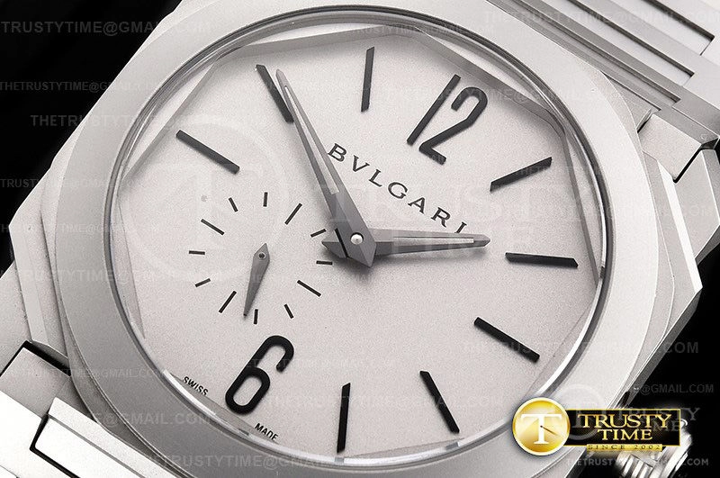 Часы Bvlgari из коллекции Octo Finissimo. Классические мужские часы Bvlgari Octo Finissimo 103011 премиального качества (Артикул магазина: BV-0687) оснащены надежным автоматическим механизмом с автоподзаводом (работает от амплитуды движения руки) калибра BVL138, в котором реализованы следующие функции: часовая, минутная и секундная стрелки, а так же максимально простой функционал без усложнений. Восьмиугольный корпус часов стального цвета, имеющий размер 40 мм и высоту 9.2 мм превосходно дополнит образ и украсит запястье своего обладателя. Для изготовления часов Bvlgari Octo Finissimo 103011 предлагаемых в нашем интернет-магазине, применяются нержавеющая сталь 316L высокого качества (Швейцарский стандарт), а так же сапфировое стекло высокой прочности, благодаря чему обеспечивается максимальная защита от сколов и механических повреждений. Отличительной чертой данной модели является серебристый циферблат, часовые индексы которого обеспечивают часовые метки. Завершает образ браслет из нержавеющей стали стального цвета с фирменной раскладывающейся застежкой Bvlgari. Водонепроницаемость данной модели составляет 30М (WR30) – допускается минимальное воздействие с водой.