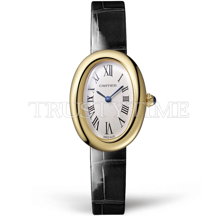 Часы Cartier из коллекции Baignoire. Классические женские часы Cartier Baignoire 1920 Watch WGBA0022 премиального качества (Артикул магазина: CR-0960) оснащены надежным кварцевым механизмом (работает от батареи) калибра Swiss Quartz ETA, в котором реализованы следующие функции: часова и минутка стрелки, а так же максимально простой функционал без усложнений. Овальный корпус часов цветы желтой золота, имеющий размер 31,4 мм х 23,09 мм и высоту 7 мм превосходно дополнит образ и украсит запястье своего обладателя. Для изготовления часов Cartier Baignoire 1920 Watch WGBA0022 предлагаемых в нашем интернет-магазине, применяются нержавеющая сталь 316F высокого качества (Швейцарский стандарт), а так же сапфировое стекло высокой прочности, благодаря чему обеспечивается максимальная защита от сколов и механических повреждений. Отличительной чертой данной модели является белый циферблат, часовые индексы которого обеспечивают римские цифры. Завершает образ кожаный ремешок черного цвета с фирменной классической застежкой Cartier. Водонепроницаемость данной модели составляет 30М (WR30) – допускается минимальное воздействие с водой.