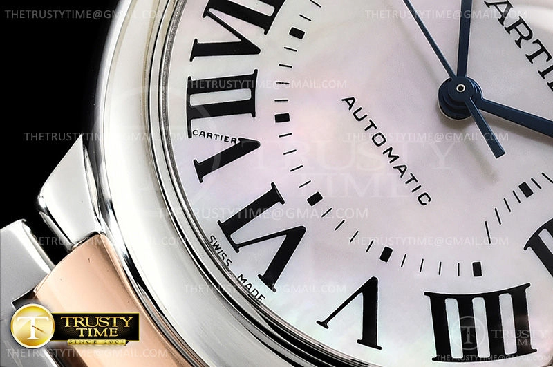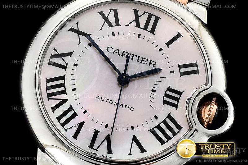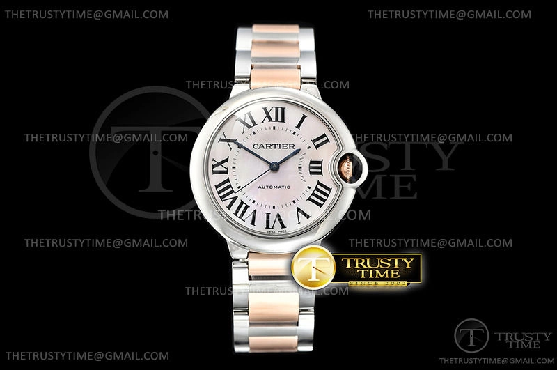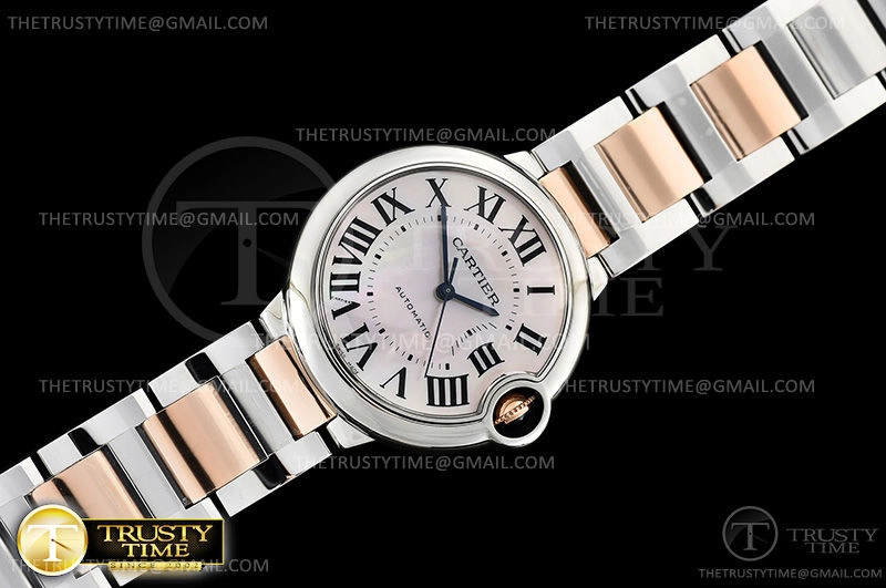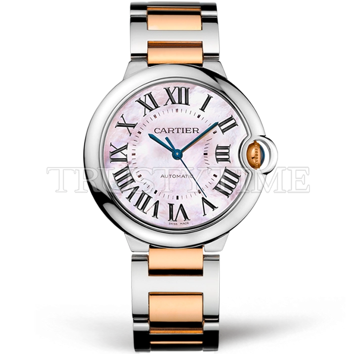 Часы Cartier из коллекции Ballon Bleu De Cartier. Классические женские часы Cartier Ballon Bleu 36 W6920033 премиального качества (Артикул магазина: CR-0500) оснащены надежным автоматическим механизмом с автоподзаводом (работает от амплитуды движения руки) калибра Seiko NH05A, в котором реализованы следующие функции: часовая, минутная и секундная стрелки, а так же максимально простой функционал без усложнений. Круглый корпус часов комбинированного сталь с розового золота цвета, имеющий размер 36 мм и высоту 12 мм превосходно дополнит образ и украсит запястье своего обладателя. Для изготовления часов Cartier Ballon Bleu 36 W6920033 предлагаемых в нашем интернет-магазине, применяются нержавеющая сталь 316F высокого качества (Швейцарский стандарт), а так же сапфировое стекло высокой прочности, благодаря чему обеспечивается максимальная защита от сколов и механических повреждений. Отличительной чертой данной модели является розовый циферблат, часовые индексы которого обеспечивают римские цифры. Завершает образ браслет из нержавеющей стали комбинированного сталь с розовым золотом цвета с фирменной раскладывающейся застежкой Cartier. Водонепроницаемость данной модели составляет 30М (WR30) – допускается минимальное воздействие с водой.