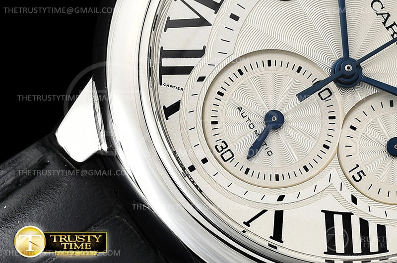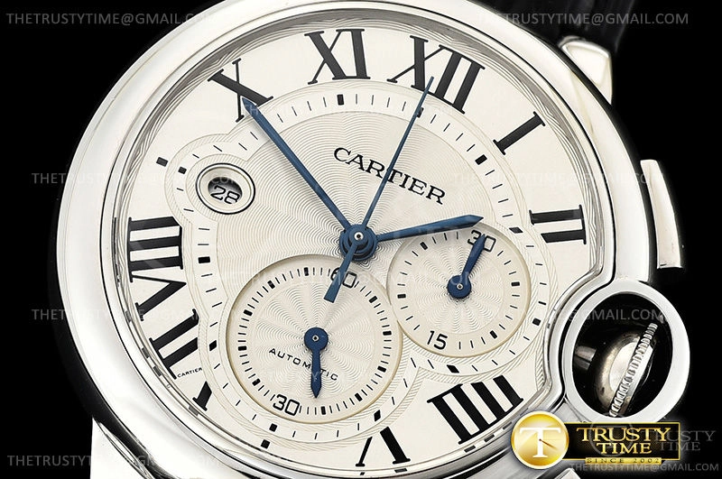 Часы Cartier из коллекции Ballon Bleu Chronograph. Спортивные мужские часы Cartier Balon Bleu Chronograph 44 W6920078 премиального качества (Артикул магазина: CR-0477) оснащены надежным автоматическим механизмом с автоподзаводом (работает от амплитуды движения руки) калибра Valjoux-7750, в котором реализованы следующие функции: часовая, минутная и секундная стрелки, а так же хронограф, дата. Круглый корпус часов стального цвета, имеющий размер 44 мм и высоту 14.8 мм превосходно дополнит образ и украсит запястье своего обладателя. Для изготовления часов Cartier Balon Bleu Chronograph 44 W6920078 предлагаемых в нашем интернет-магазине, применяются нержавеющая сталь 316F высокого качества (Швейцарский стандарт), а так же сапфировое стекло высокой прочности, благодаря чему обеспечивается максимальная защита от сколов и механических повреждений. Отличительной чертой данной модели является серебристый циферблат, часовые индексы которого обеспечивают римские цифры. Завершает образ кожаный ремешок черного цвета с фирменной раскладывающейся застежкой Cartier. Водонепроницаемость данной модели составляет 30М (WR30) – допускается минимальное воздействие с водой.