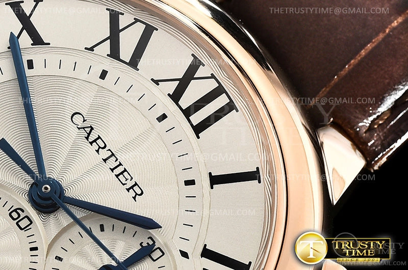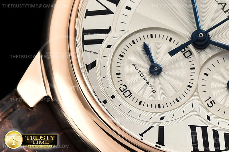 Часы Cartier из коллекции Ballon Bleu Chronograph. Спортивные мужские часы Cartier Balon Bleu Chronograph 44 W6920009 премиального качества (Артикул магазина: CR-0478) оснащены надежным автоматическим механизмом с автоподзаводом (работает от амплитуды движения руки) калибра Valjoux-7750, в котором реализованы следующие функции: часовая, минутная и секундная стрелки, а так же хронограф, дата. Круглый корпус часов розового цвета, имеющий размер 44 мм и высоту 14.8 мм превосходно дополнит образ и украсит запястье своего обладателя. Для изготовления часов Cartier Balon Bleu Chronograph 44 W6920009 предлагаемых в нашем интернет-магазине, применяются нержавеющая сталь 316F высокого качества (Швейцарский стандарт), а так же сапфировое стекло высокой прочности, благодаря чему обеспечивается максимальная защита от сколов и механических повреждений. Отличительной чертой данной модели является серебристый циферблат, часовые индексы которого обеспечивают римские цифры. Завершает образ кожаный ремешок коричневого цвета с фирменной раскладывающейся застежкой Cartier. Водонепроницаемость данной модели составляет 30М (WR30) – допускается минимальное воздействие с водой.
