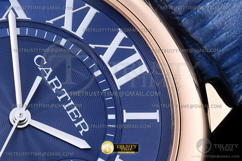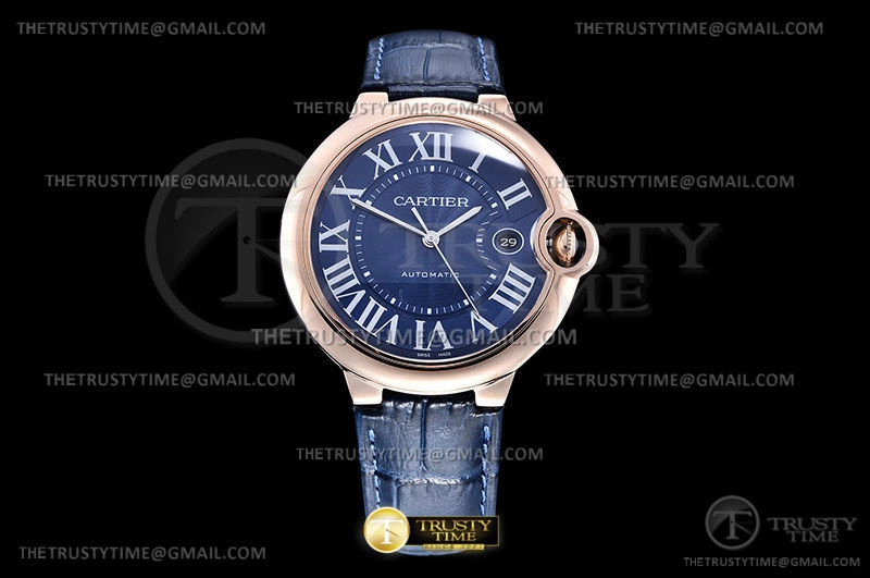 Часы Cartier из коллекции Ballon Bleu De Cartier. Классические мужские часы Cartier Ballon Bleu 42 WGBB0036 премиального качества (Артикул магазина: CR-0748) оснащены надежным автоматическим механизмом с автоподзаводом (работает от амплитуды движения руки) калибра ETA2824-2, в котором реализованы следующие функции: часовая, минутная и секундная стрелки, а так же дата. Круглый корпус часов розового цвета, имеющий размер 42 мм и высоту 13 мм превосходно дополнит образ и украсит запястье своего обладателя. Для изготовления часов Cartier Ballon Bleu 42 WGBB0036 предлагаемых в нашем интернет-магазине, применяются нержавеющая сталь 316F высокого качества (Швейцарский стандарт), а так же сапфировое стекло высокой прочности, благодаря чему обеспечивается максимальная защита от сколов и механических повреждений. Отличительной чертой данной модели является синий циферблат, часовые индексы которого обеспечивают римские цифры. Завершает образ кожаный ремешок синего цвета с фирменной раскладывающейся застежкой Cartier. Водонепроницаемость данной модели составляет 30М (WR30) – допускается минимальное воздействие с водой.