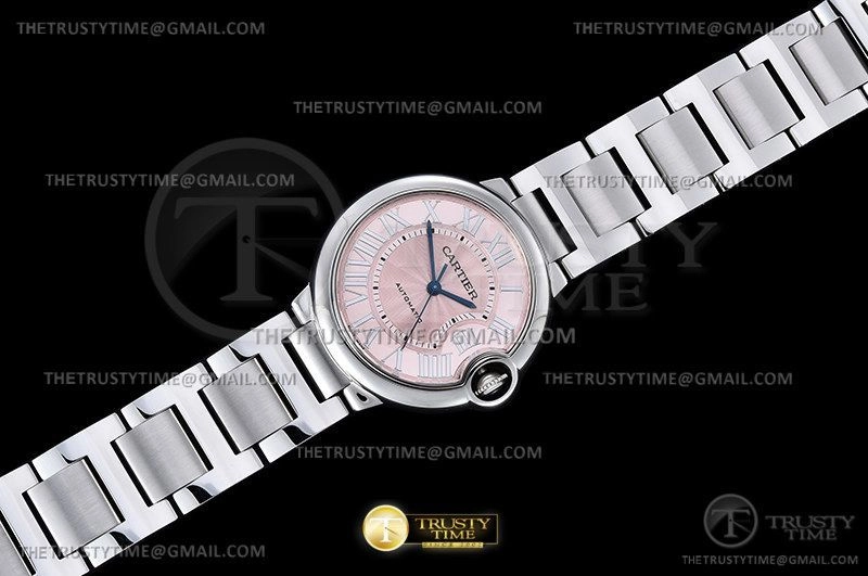 Часы Cartier из коллекции Ballon Bleu De Cartier. Классические женские часы Cartier Ballon Bleu 36 W6920041 премиального качества (Артикул магазина: CR-0759) оснащены надежным автоматическим механизмом с автоподзаводом (работает от амплитуды движения руки) калибра 076, в котором реализованы следующие функции: часовая, минутная и секундная стрелки, а так же максимально простой функционал без усложнений. Круглый корпус часов стального цвета, имеющий размер 36 мм и высоту 12 мм превосходно дополнит образ и украсит запястье своего обладателя. Для изготовления часов Cartier Ballon Bleu 36 W6920041 предлагаемых в нашем интернет-магазине, применяются нержавеющая сталь 316F высокого качества (Швейцарский стандарт), а так же сапфировое стекло высокой прочности, благодаря чему обеспечивается максимальная защита от сколов и механических повреждений. Отличительной чертой данной модели является розовый циферблат, часовые индексы которого обеспечивают римские цифры. Завершает образ браслет из нержавеющей стали стального цвета с фирменной раскладывающейся застежкой Cartier. Водонепроницаемость данной модели составляет 30М (WR30) – допускается минимальное воздействие с водой.