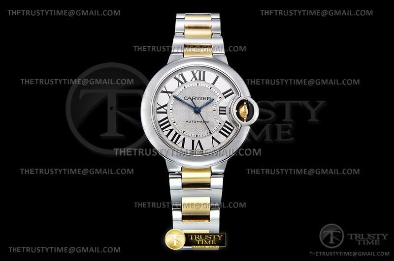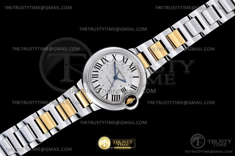 Часы Cartier из коллекции Ballon Bleu De Cartier. Классические женские часы Cartier Ballon Bleu 33 W2BB0002 премиального качества (Артикул магазина: CR-0766) оснащены надежным автоматическим механизмом с автоподзаводом (работает от амплитуды движения руки) калибра 076, в котором реализованы следующие функции: часовая, минутная и секундная стрелки, а так же максимально простой функционал без усложнений. Круглый корпус часов комбинированного сталь с желтого золота цвета, имеющий размер 33 мм и высоту 10 мм превосходно дополнит образ и украсит запястье своего обладателя. Для изготовления часов Cartier Ballon Bleu 33 W2BB0002 предлагаемых в нашем интернет-магазине, применяются нержавеющая сталь 316F высокого качества (Швейцарский стандарт), а так же сапфировое стекло высокой прочности, благодаря чему обеспечивается максимальная защита от сколов и механических повреждений. Отличительной чертой данной модели является серебристый циферблат, часовые индексы которого обеспечивают римские цифры. Завершает образ браслет из нержавеющей стали комбинированного сталь с желтым золотом цвета с фирменной раскладывающейся застежкой Cartier. Водонепроницаемость данной модели составляет 30М (WR30) – допускается минимальное воздействие с водой.