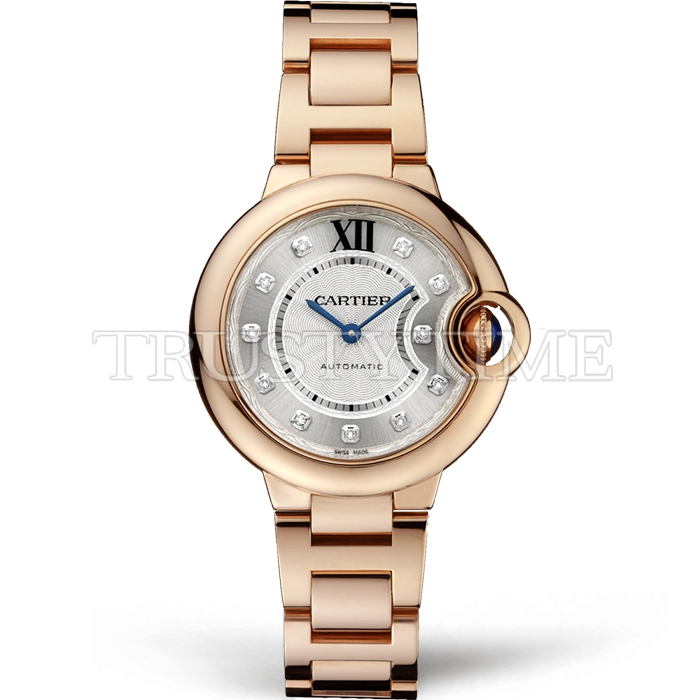 Часы Cartier из коллекции Ballon Bleu De Cartier. Классические женские часы Cartier Ballon Bleu 33 WE902039 премиального качества (Артикул магазина: CR-0769) оснащены надежным автоматическим механизмом с автоподзаводом (работает от амплитуды движения руки) калибра 076, в котором реализованы следующие функции: часовая, минутная и секундная стрелки, а так же максимально простой функционал без усложнений. Круглый корпус часов розового цвета, имеющий размер 33 мм и высоту 10 мм превосходно дополнит образ и украсит запястье своего обладателя. Для изготовления часов Cartier Ballon Bleu 33 WE902039 предлагаемых в нашем интернет-магазине, применяются нержавеющая сталь 316F высокого качества (Швейцарский стандарт), а так же сапфировое стекло высокой прочности, благодаря чему обеспечивается максимальная защита от сколов и механических повреждений. Отличительной чертой данной модели является серебристый циферблат, часовые индексы которого обеспечивают камни. Завершает образ браслет из нержавеющей стали цвета розового золота с фирменной раскладывающейся застежкой Cartier. Водонепроницаемость данной модели составляет 30М (WR30) – допускается минимальное воздействие с водой.