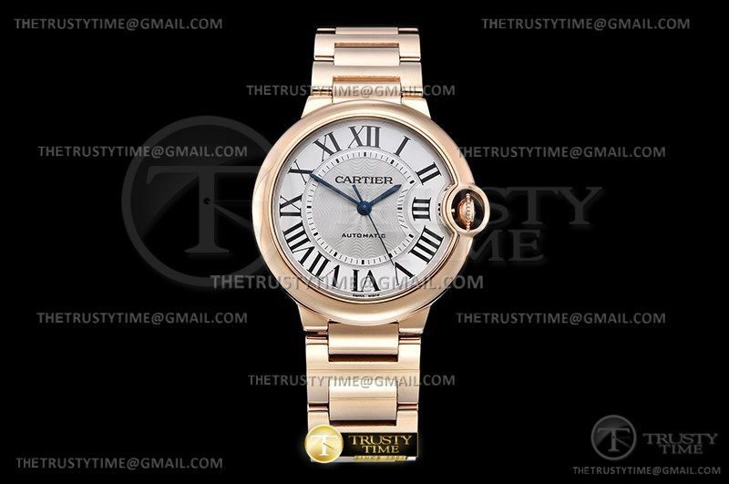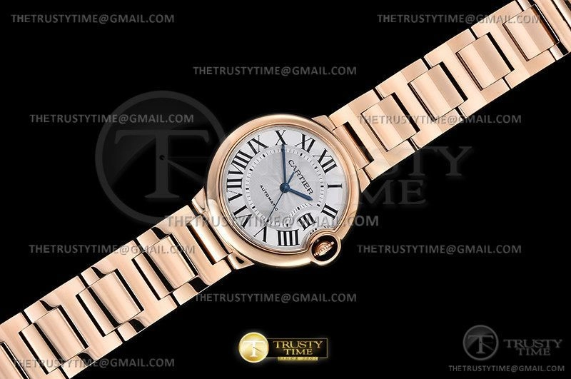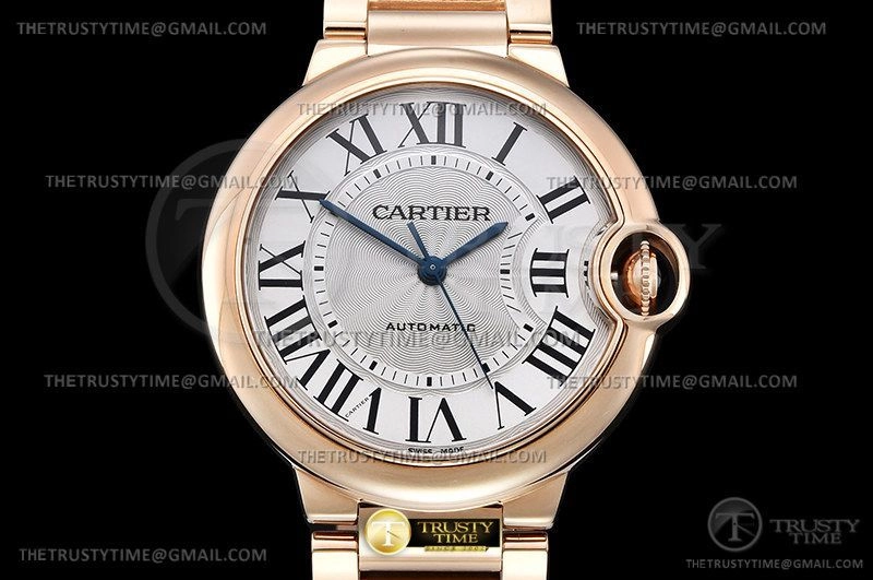 Часы Cartier из коллекции Ballon Bleu De Cartier. Классические женские часы Cartier Ballon Bleu 36 WGBB0008 премиального качества (Артикул магазина: CR-0773) оснащены надежным автоматическим механизмом с автоподзаводом (работает от амплитуды движения руки) калибра 076, в котором реализованы следующие функции: часовая, минутная и секундная стрелки, а так же максимально простой функционал без усложнений. Круглый корпус часов розового цвета, имеющий размер 36 мм и высоту 12 мм превосходно дополнит образ и украсит запястье своего обладателя. Для изготовления часов Cartier Ballon Bleu 36 WGBB0008 предлагаемых в нашем интернет-магазине, применяются нержавеющая сталь 316F высокого качества (Швейцарский стандарт), а так же сапфировое стекло высокой прочности, благодаря чему обеспечивается максимальная защита от сколов и механических повреждений. Отличительной чертой данной модели является серебристый циферблат, часовые индексы которого обеспечивают римские цифры. Завершает образ браслет из нержавеющей стали цвета розового золота с фирменной раскладывающейся застежкой Cartier. Водонепроницаемость данной модели составляет 30М (WR30) – допускается минимальное воздействие с водой.