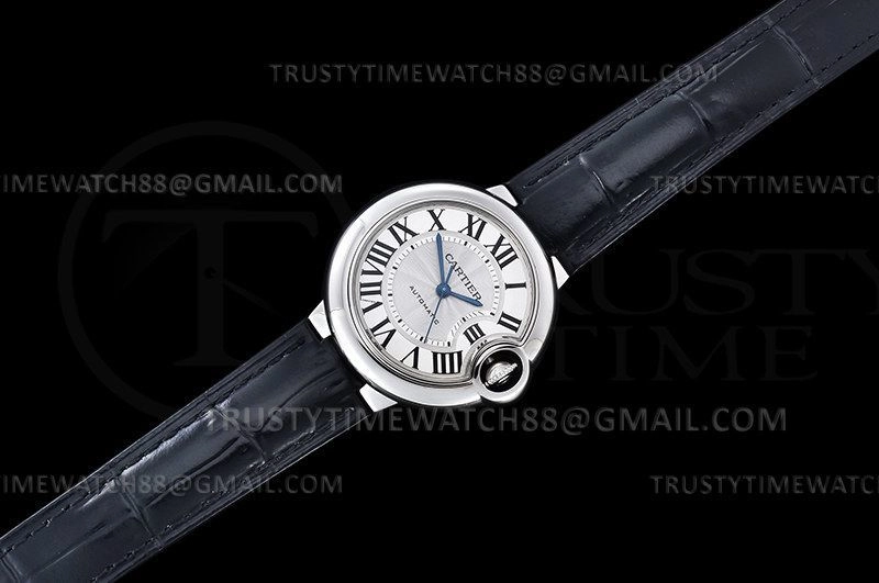 Часы Cartier из коллекции Ballon Bleu De Cartier. Классические женские часы Cartier Ballon Bleu 33 W6920085 премиального качества (Артикул магазина: CR-0785) оснащены надежным автоматическим механизмом с автоподзаводом (работает от амплитуды движения руки) калибра 076, в котором реализованы следующие функции: часовая, минутная и секундная стрелки, а так же максимально простой функционал без усложнений. Круглый корпус часов стального цвета, имеющий размер 33 мм и высоту 10 мм превосходно дополнит образ и украсит запястье своего обладателя. Для изготовления часов Cartier Ballon Bleu 33 W6920085 предлагаемых в нашем интернет-магазине, применяются нержавеющая сталь 316F высокого качества (Швейцарский стандарт), а так же сапфировое стекло высокой прочности, благодаря чему обеспечивается максимальная защита от сколов и механических повреждений. Отличительной чертой данной модели является серебристый циферблат, часовые индексы которого обеспечивают римские цифры. Завершает образ кожаный ремешок черного цвета с фирменной раскладывающейся застежкой Cartier. Водонепроницаемость данной модели составляет 30М (WR30) – допускается минимальное воздействие с водой.