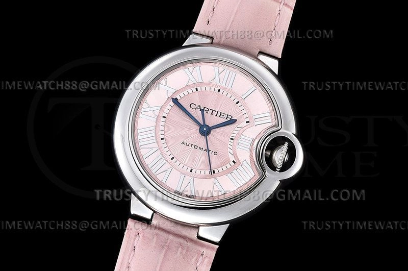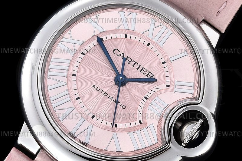 Часы Cartier из коллекции Ballon Bleu De Cartier. Классические женские часы Cartier Ballon Bleu 33 WSBB0002 премиального качества (Артикул магазина: CR-0786) оснащены надежным автоматическим механизмом с автоподзаводом (работает от амплитуды движения руки) калибра 076, в котором реализованы следующие функции: часовая, минутная и секундная стрелки, а так же максимально простой функционал без усложнений. Круглый корпус часов стального цвета, имеющий размер 33 мм и высоту 10 мм превосходно дополнит образ и украсит запястье своего обладателя. Для изготовления часов Cartier Ballon Bleu 33 WSBB0002 предлагаемых в нашем интернет-магазине, применяются нержавеющая сталь 316F высокого качества (Швейцарский стандарт), а так же сапфировое стекло высокой прочности, благодаря чему обеспечивается максимальная защита от сколов и механических повреждений. Отличительной чертой данной модели является розовый циферблат, часовые индексы которого обеспечивают римские цифры. Завершает образ кожаный ремешок розового цвета с фирменной раскладывающейся застежкой Cartier. Водонепроницаемость данной модели составляет 30М (WR30) – допускается минимальное воздействие с водой.