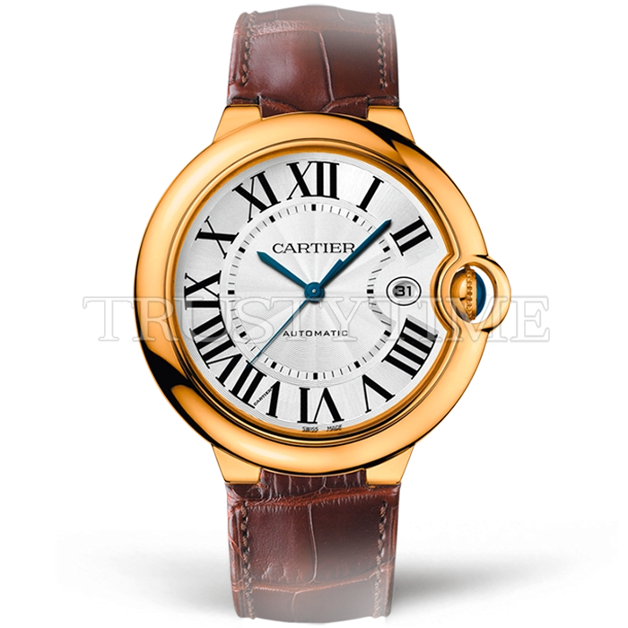 Часы Cartier из коллекции Ballon Bleu De Cartier. Классические мужские часы Cartier Ballon Bleu 42 W6900551 премиального качества (Артикул магазина: CR-0427) оснащены надежным автоматическим механизмом с автоподзаводом (работает от амплитуды движения руки) калибра Seiko NH05A, в котором реализованы следующие функции: часовая, минутная и секундная стрелки, а так же дата. Круглый корпус часов цветы желтой золота, имеющий размер 42 мм и высоту 13 мм превосходно дополнит образ и украсит запястье своего обладателя. Для изготовления часов Cartier Ballon Bleu 42 W6900551 предлагаемых в нашем интернет-магазине, применяются нержавеющая сталь 316L высокого качества (Швейцарский стандарт), а так же сапфировое стекло высокой прочности, благодаря чему обеспечивается максимальная защита от сколов и механических повреждений. Отличительной чертой данной модели является серебристый циферблат, часовые индексы которого обеспечивают римские цифры. Завершает образ кожаный ремешок коричневого цвета с фирменной раскладывающейся застежкой Cartier. Водонепроницаемость данной модели составляет 30М (WR30) – допускается минимальное воздействие с водой.