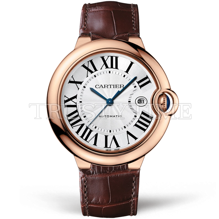 Часы Cartier из коллекции Ballon Bleu De Cartier. Классические мужские часы Cartier Ballon Bleu 42 WGBB0017 премиального качества (Артикул магазина: CR-0434) оснащены надежным автоматическим механизмом с автоподзаводом (работает от амплитуды движения руки) калибра Seiko NH05A, в котором реализованы следующие функции: часовая, минутная и секундная стрелки, а так же дата. Круглый корпус часов розового цвета, имеющий размер 42 мм и высоту 13 мм превосходно дополнит образ и украсит запястье своего обладателя. Для изготовления часов Cartier Ballon Bleu 42 WGBB0017 предлагаемых в нашем интернет-магазине, применяются нержавеющая сталь 316L высокого качества (Швейцарский стандарт), а так же сапфировое стекло высокой прочности, благодаря чему обеспечивается максимальная защита от сколов и механических повреждений. Отличительной чертой данной модели является серебристый циферблат, часовые индексы которого обеспечивают римские цифры. Завершает образ кожаный ремешок коричневого цвета с фирменной раскладывающейся застежкой Cartier. Водонепроницаемость данной модели составляет 30М (WR30) – допускается минимальное воздействие с водой.