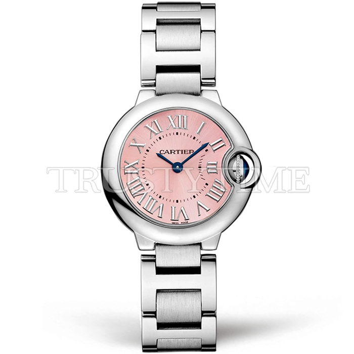 Часы Cartier из коллекции Ballon Bleu De Cartier. Классические женские часы Cartier Ballon Bleu 28 W6920038 премиального качества (Артикул магазина: CR-0846) оснащены надежным кварцевым механизмом (работает от батареи) калибра Swiss Quartz ETA, в котором реализованы следующие функции: часова и минутка стрелки, а так же максимально простой функционал без усложнений. Круглый корпус часов стального цвета, имеющий размер 28 мм и высоту 9.5 мм превосходно дополнит образ и украсит запястье своего обладателя. Для изготовления часов Cartier Ballon Bleu 28 W6920038 предлагаемых в нашем интернет-магазине, применяются нержавеющая сталь 316L высокого качества (Швейцарский стандарт), а так же сапфировое стекло высокой прочности, благодаря чему обеспечивается максимальная защита от сколов и механических повреждений. Отличительной чертой данной модели является розовый циферблат, часовые индексы которого обеспечивают римские цифры. Завершает образ браслет из нержавеющей стали стального цвета с фирменной раскладывающейся застежкой Cartier. Водонепроницаемость данной модели составляет 30М (WR30) – допускается минимальное воздействие с водой.