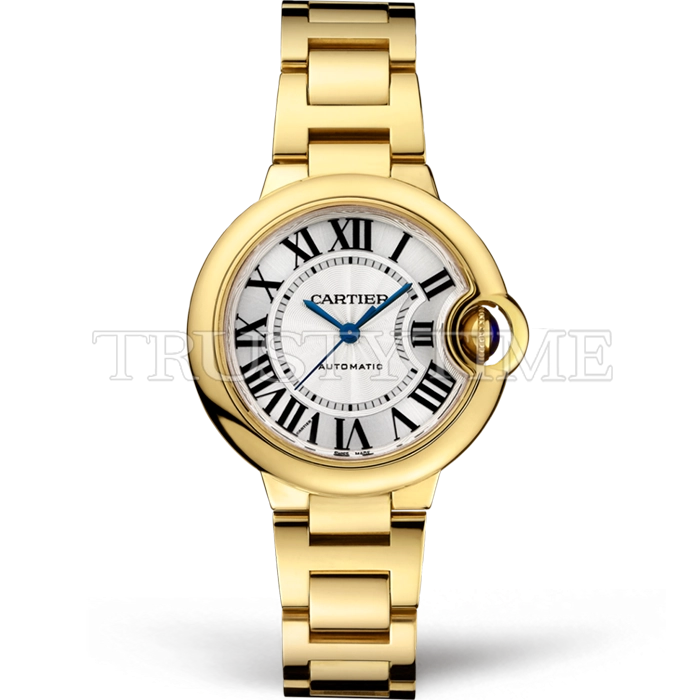 Часы Cartier из коллекции Ballon Bleu De Cartier. Классические женские часы Cartier Ballon Bleu 33 WGBB0005 премиального качества (Артикул магазина: CR-0849) оснащены надежным автоматическим механизмом с автоподзаводом (работает от амплитуды движения руки) калибра 076, в котором реализованы следующие функции: часовая, минутная и секундная стрелки, а так же максимально простой функционал без усложнений. Круглый корпус часов цветы желтой золота, имеющий размер 33 мм и высоту 10 мм превосходно дополнит образ и украсит запястье своего обладателя. Для изготовления часов Cartier Ballon Bleu 33 WGBB0005 предлагаемых в нашем интернет-магазине, применяются нержавеющая сталь 316F высокого качества (Швейцарский стандарт), а так же сапфировое стекло высокой прочности, благодаря чему обеспечивается максимальная защита от сколов и механических повреждений. Отличительной чертой данной модели является серебристый циферблат, часовые индексы которого обеспечивают римские цифры. Завершает образ браслет из нержавеющей стали цвета желтого золота с фирменной раскладывающейся застежкой Cartier. Водонепроницаемость данной модели составляет 30М (WR30) – допускается минимальное воздействие с водой.
