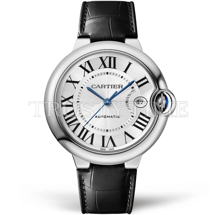 Часы Cartier из коллекции Ballon Bleu De Cartier. Классические женские часы Cartier Ballon Bleu 40 WSBB0039 премиального качества (Артикул магазина: CR-0919) оснащены надежным автоматическим механизмом с автоподзаводом (работает от амплитуды движения руки) калибра ETA2824-2, в котором реализованы следующие функции: часовая, минутная и секундная стрелки, а так же дата. Круглый корпус часов стального цвета, имеющий размер 40 мм и высоту 12.5 мм превосходно дополнит образ и украсит запястье своего обладателя. Для изготовления часов Cartier Ballon Bleu 40 WSBB0039 предлагаемых в нашем интернет-магазине, применяются нержавеющая сталь 316F высокого качества (Швейцарский стандарт), а так же сапфировое стекло высокой прочности, благодаря чему обеспечивается максимальная защита от сколов и механических повреждений. Отличительной чертой данной модели является серебристый циферблат, часовые индексы которого обеспечивают римские цифры. Завершает образ кожаный ремешок черного цвета с фирменной раскладывающейся застежкой Cartier. Водонепроницаемость данной модели составляет 30М (WR30) – допускается минимальное воздействие с водой.