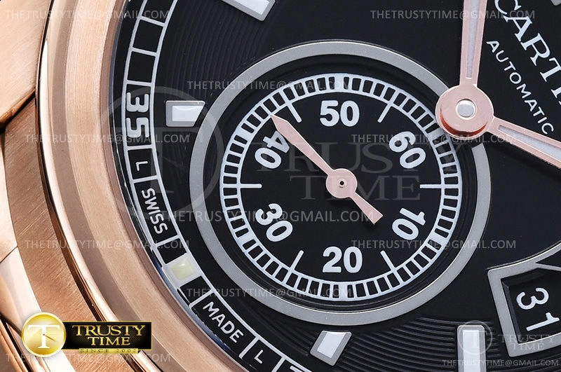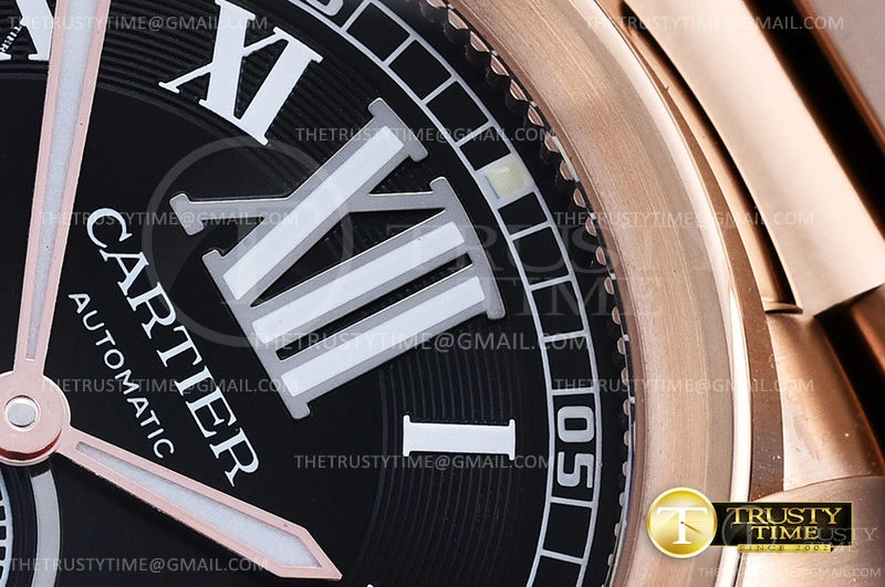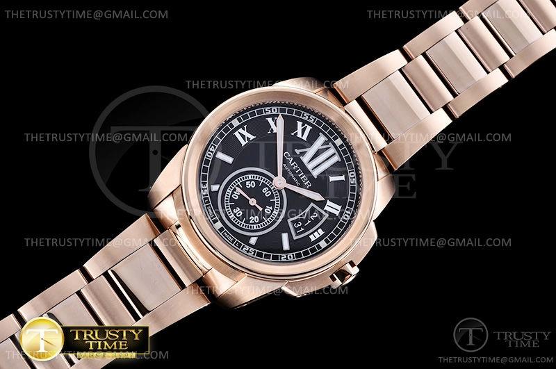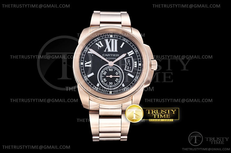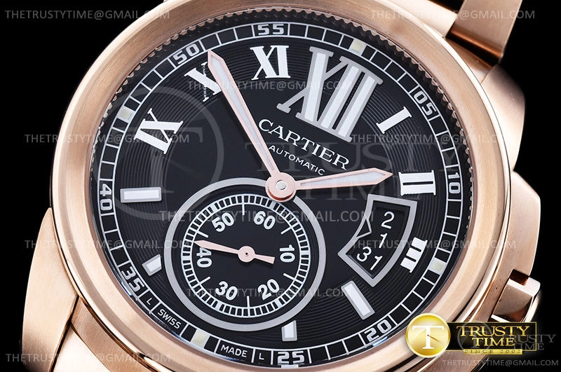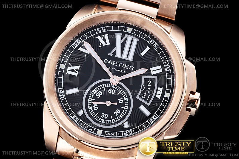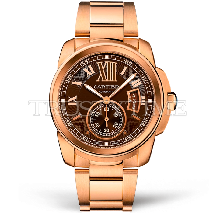 Часы Cartier из коллекции Calibre De Cartier. Классические мужские часы Cartier Calibre de Cartier 42 W7100040 премиального качества (Артикул магазина: CR-0542) оснащены надежным автоматическим механизмом с автоподзаводом (работает от амплитуды движения руки) калибра MY8205, в котором реализованы следующие функции: часовая, минутная и секундная стрелки, а так же дата. Круглый корпус часов розового цвета, имеющий размер 42 мм и высоту 12 мм превосходно дополнит образ и украсит запястье своего обладателя. Для изготовления часов Cartier Calibre de Cartier 42 W7100040 предлагаемых в нашем интернет-магазине, применяются нержавеющая сталь 316L высокого качества (Швейцарский стандарт), а так же сапфировое стекло высокой прочности, благодаря чему обеспечивается максимальная защита от сколов и механических повреждений. Отличительной чертой данной модели является черный циферблат, часовые индексы которого обеспечивают римские цифры. Завершает образ браслет из нержавеющей стали цвета розового золота с фирменной раскладывающейся застежкой Cartier. Водонепроницаемость данной модели составляет 30М (WR30) – допускается минимальное воздействие с водой.