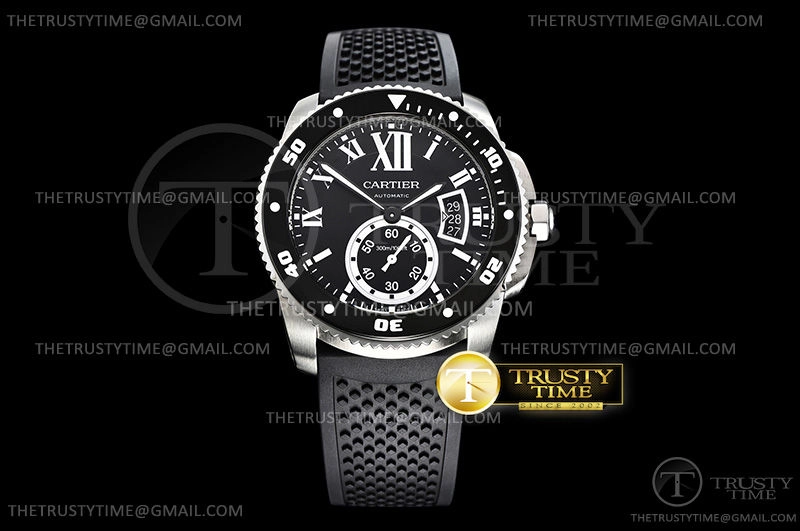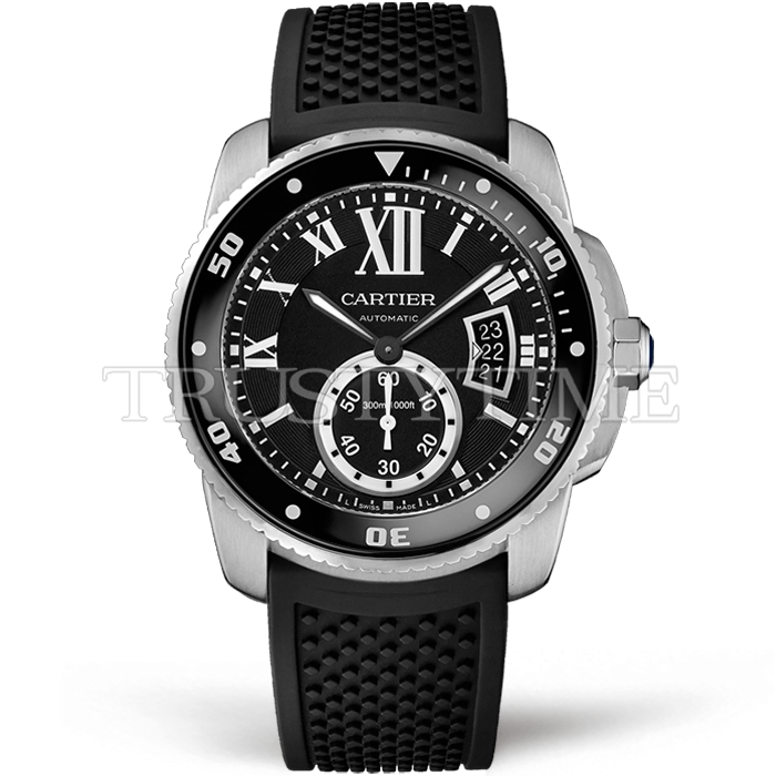 Часы Cartier из коллекции Calibre De Cartier. Классические мужские часы Cartier Calibre de Cartier Diver 42 W7100056 премиального качества (Артикул магазина: CR-0540) оснащены надежным автоматическим механизмом с автоподзаводом (работает от амплитуды движения руки) калибра 1904-PS, в котором реализованы следующие функции: часовая, минутная и секундная стрелки, а так же дата. Круглый корпус часов стального цвета, имеющий размер 42 мм и высоту 11 мм превосходно дополнит образ и украсит запястье своего обладателя. Для изготовления часов Cartier Calibre de Cartier Diver 42 W7100056 предлагаемых в нашем интернет-магазине, применяются нержавеющая сталь 316L высокого качества (Швейцарский стандарт), а так же сапфировое стекло высокой прочности, благодаря чему обеспечивается максимальная защита от сколов и механических повреждений. Отличительной чертой данной модели является черный циферблат, часовые индексы которого обеспечивают римские цифры. Завершает образ каучуковый ремешок черного цвета с фирменной классической застежкой Cartier. Водонепроницаемость данной модели составляет 30М (WR30) – допускается минимальное воздействие с водой.