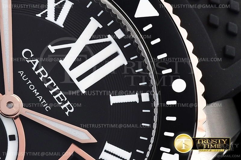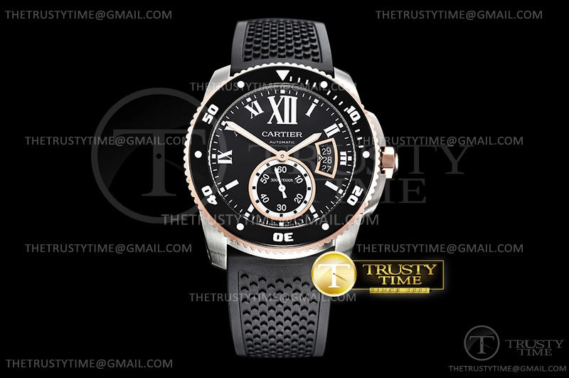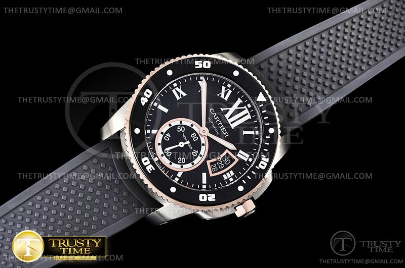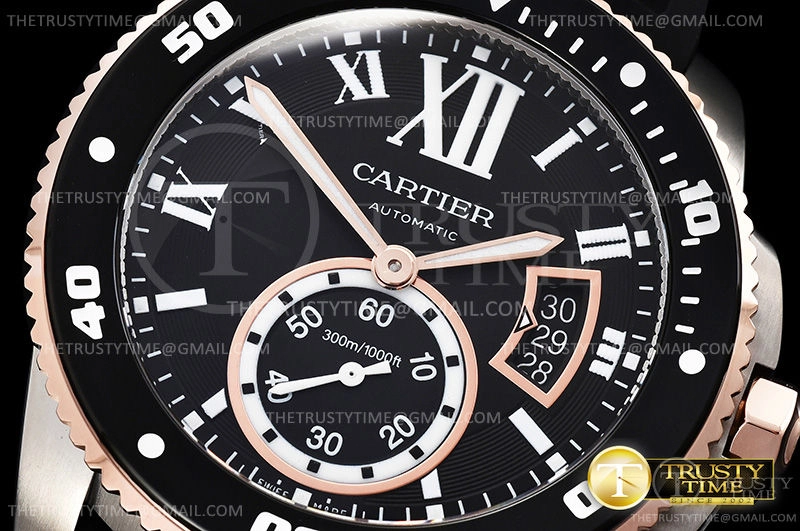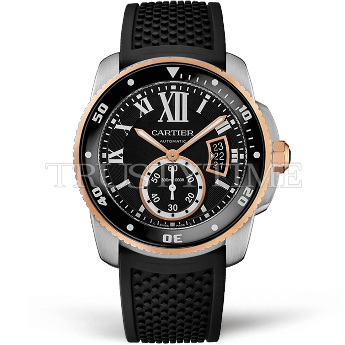 Часы Cartier из коллекции Calibre De Cartier. Классические мужские часы Cartier Calibre de Cartier Diver 42 W7100055 премиального качества (Артикул магазина: CR-0541) оснащены надежным автоматическим механизмом с автоподзаводом (работает от амплитуды движения руки) калибра 1904-PS, в котором реализованы следующие функции: часовая, минутная и секундная стрелки, а так же дата. Круглый корпус часов комбинированного сталь с розового золота цвета, имеющий размер 42 мм и высоту 11 мм превосходно дополнит образ и украсит запястье своего обладателя. Для изготовления часов Cartier Calibre de Cartier Diver 42 W7100055 предлагаемых в нашем интернет-магазине, применяются нержавеющая сталь 316L высокого качества (Швейцарский стандарт), а так же сапфировое стекло высокой прочности, благодаря чему обеспечивается максимальная защита от сколов и механических повреждений. Отличительной чертой данной модели является черный циферблат, часовые индексы которого обеспечивают римские цифры. Завершает образ каучуковый ремешок черного цвета с фирменной классической застежкой Cartier. Водонепроницаемость данной модели составляет 30М (WR30) – допускается минимальное воздействие с водой.