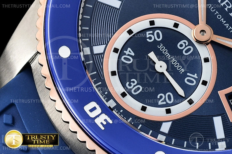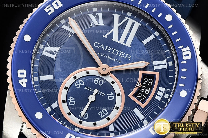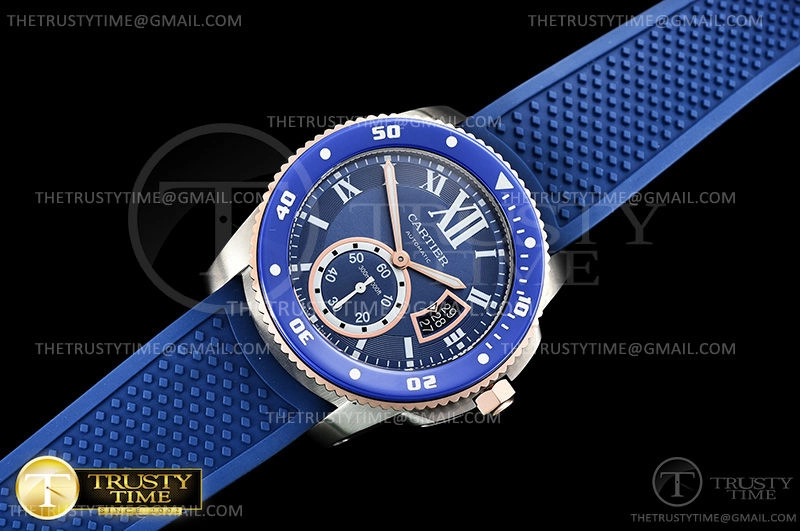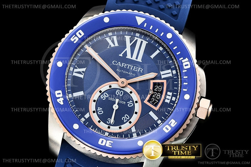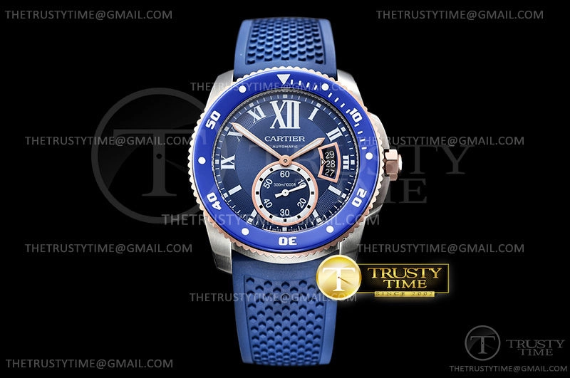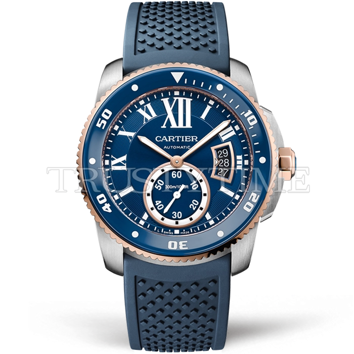 Часы Cartier из коллекции Calibre De Cartier. Классические мужские часы Cartier Calibre de Cartier Diver 42 W2CA0009 премиального качества (Артикул магазина: CR-0537) оснащены надежным автоматическим механизмом с автоподзаводом (работает от амплитуды движения руки) калибра 1904-PS, в котором реализованы следующие функции: часовая, минутная и секундная стрелки, а так же дата. Круглый корпус часов комбинированного сталь с розового золота цвета, имеющий размер 42 мм и высоту 11 мм превосходно дополнит образ и украсит запястье своего обладателя. Для изготовления часов Cartier Calibre de Cartier Diver 42 W2CA0009 предлагаемых в нашем интернет-магазине, применяются нержавеющая сталь 316L высокого качества (Швейцарский стандарт), а так же сапфировое стекло высокой прочности, благодаря чему обеспечивается максимальная защита от сколов и механических повреждений. Отличительной чертой данной модели является синий циферблат, часовые индексы которого обеспечивают римские цифры. Завершает образ каучуковый ремешок синего цвета с фирменной классической застежкой Cartier. Водонепроницаемость данной модели составляет 30М (WR30) – допускается минимальное воздействие с водой.