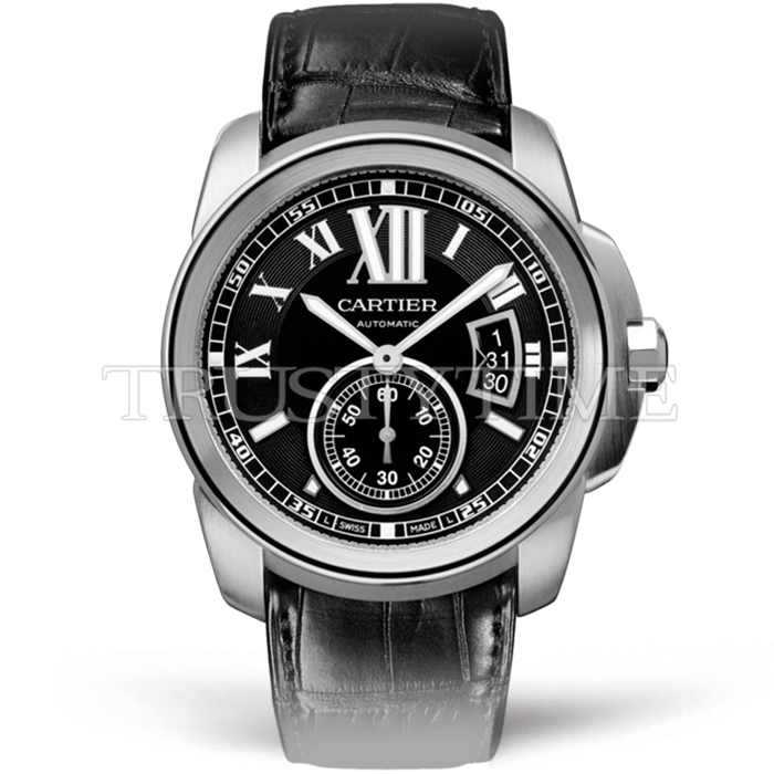 Часы Cartier из коллекции Calibre De Cartier. Классические мужские часы Cartier Calibre de Cartier 42 W7100041 премиального качества (Артикул магазина: CR-0474) оснащены надежным автоматическим механизмом с автоподзаводом (работает от амплитуды движения руки) калибра MY8205, в котором реализованы следующие функции: часовая, минутная и секундная стрелки, а так же дата. Круглый корпус часов стального цвета, имеющий размер 42 мм и высоту 14 мм превосходно дополнит образ и украсит запястье своего обладателя. Для изготовления часов Cartier Calibre de Cartier 42 W7100041 предлагаемых в нашем интернет-магазине, применяются нержавеющая сталь 316F высокого качества (Швейцарский стандарт), а так же сапфировое стекло высокой прочности, благодаря чему обеспечивается максимальная защита от сколов и механических повреждений. Отличительной чертой данной модели является черный циферблат, часовые индексы которого обеспечивают римские цифры. Завершает образ кожаный ремешок черного цвета с фирменной раскладывающейся застежкой Cartier. Водонепроницаемость данной модели составляет 30М (WR30) – допускается минимальное воздействие с водой.