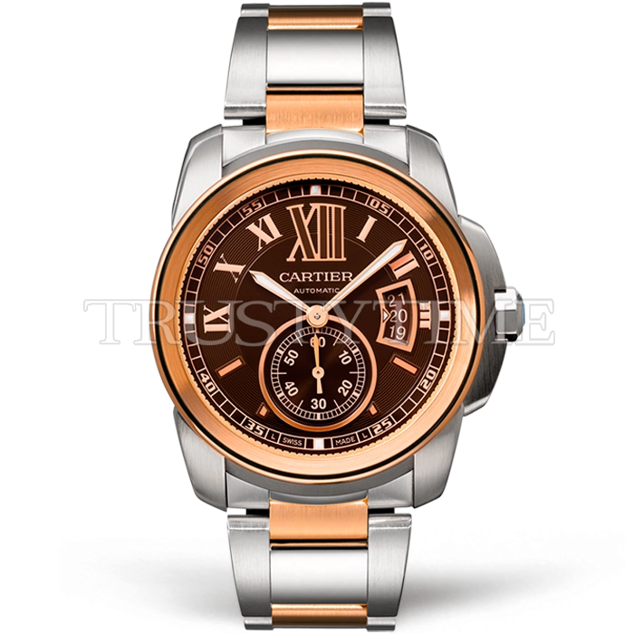 Часы Cartier из коллекции Calibre De Cartier. Классические мужские часы Cartier Calibre de Cartier 42 W7100050 премиального качества (Артикул магазина: CR-0859) оснащены надежным автоматическим механизмом с автоподзаводом (работает от амплитуды движения руки) калибра MY8205, в котором реализованы следующие функции: часовая, минутная и секундная стрелки, а так же дата. Круглый корпус часов комбинированного сталь с розового золота цвета, имеющий размер 42 мм и высоту 12 мм превосходно дополнит образ и украсит запястье своего обладателя. Для изготовления часов Cartier Calibre de Cartier 42 W7100050 предлагаемых в нашем интернет-магазине, применяются нержавеющая сталь 316L высокого качества (Швейцарский стандарт), а так же сапфировое стекло высокой прочности, благодаря чему обеспечивается максимальная защита от сколов и механических повреждений. Отличительной чертой данной модели является коричневый циферблат, часовые индексы которого обеспечивают римские цифры. Завершает образ браслет из нержавеющей стали комбинированного сталь с розовым золотом цвета с фирменной раскладывающейся застежкой Cartier. Водонепроницаемость данной модели составляет 30М (WR30) – допускается минимальное воздействие с водой.