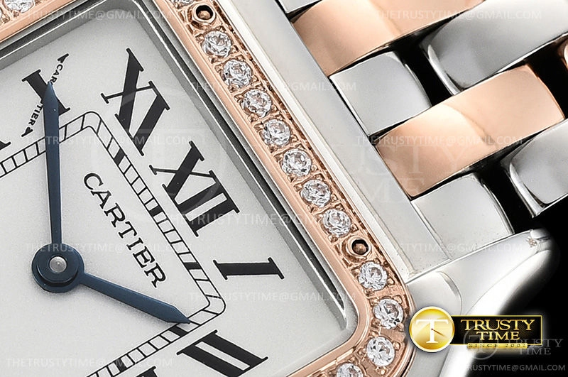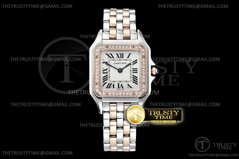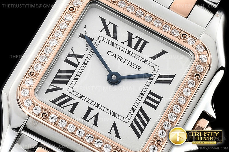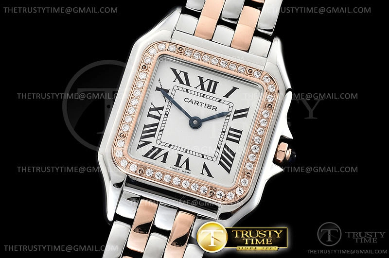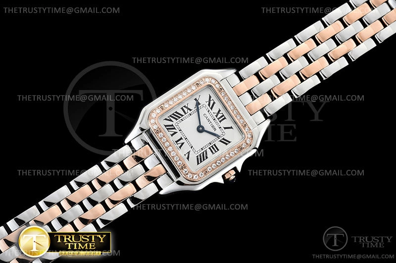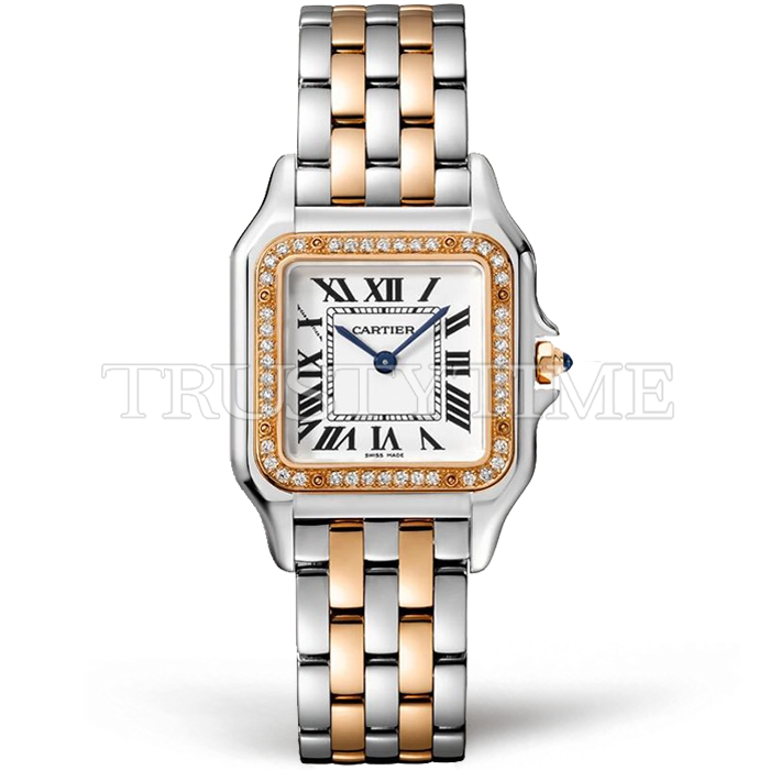 Часы Cartier из коллекции Panthere Secrete De Ladies. Классические женские часы Cartier Panthere Secrete De Ladies 27 W3PN0007 премиального качества (Артикул магазина: CR-0628) оснащены надежным кварцевым механизмом (работает от батареи) калибра Swiss Quartz ETA, в котором реализованы следующие функции: часова и минутка стрелки, а так же максимально простой функционал без усложнений. Квадратный корпус часов комбинированного сталь с розового золота цвета, имеющий размер 27 мм х 37 мм и высоту 6.5 мм превосходно дополнит образ и украсит запястье своего обладателя. Для изготовления часов Cartier Panthere Secrete De Ladies 27 W3PN0007 предлагаемых в нашем интернет-магазине, применяются нержавеющая сталь 316L высокого качества (Швейцарский стандарт), а так же сапфировое стекло высокой прочности, благодаря чему обеспечивается максимальная защита от сколов и механических повреждений. Отличительной чертой данной модели является белый циферблат, часовые индексы которого обеспечивают римские цифры. Завершает образ браслет из нержавеющей стали комбинированного сталь с розовым золотом цвета с фирменной раскладывающейся застежкой Cartier. Водонепроницаемость данной модели составляет 30М (WR30) – допускается минимальное воздействие с водой.