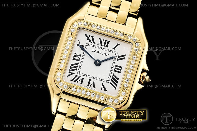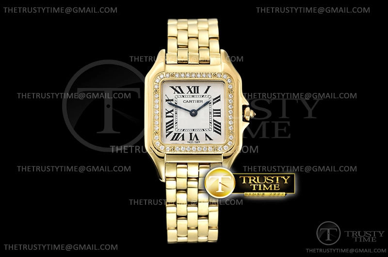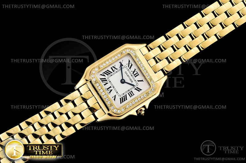 Часы Cartier из коллекции Panthere Secrete De Ladies. Классические женские часы Cartier Panthere Secrete De Ladies 27 WJPN0016 премиального качества (Артикул магазина: CR-0633) оснащены надежным кварцевым механизмом (работает от батареи) калибра Swiss Quartz ETA, в котором реализованы следующие функции: часова и минутка стрелки, а так же максимально простой функционал без усложнений. Квадратный корпус часов цветы желтой золота, имеющий размер 27 мм х 37 мм и высоту 6.5 мм превосходно дополнит образ и украсит запястье своего обладателя. Для изготовления часов Cartier Panthere Secrete De Ladies 27 WJPN0016 предлагаемых в нашем интернет-магазине, применяются нержавеющая сталь 316L высокого качества (Швейцарский стандарт), а так же сапфировое стекло высокой прочности, благодаря чему обеспечивается максимальная защита от сколов и механических повреждений. Отличительной чертой данной модели является белый циферблат, часовые индексы которого обеспечивают римские цифры. Завершает образ браслет из нержавеющей стали цвета желтого золота с фирменной раскладывающейся застежкой Cartier. Водонепроницаемость данной модели составляет 30М (WR30) – допускается минимальное воздействие с водой.