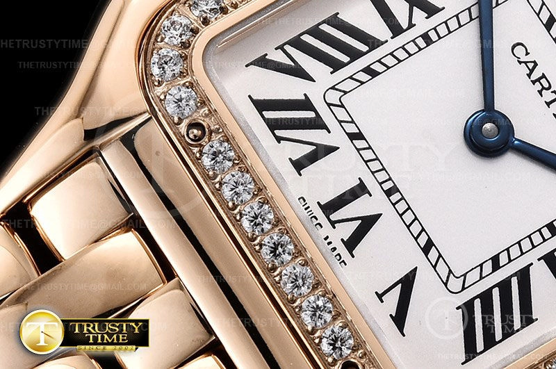 Часы Cartier из коллекции Panthere Secrete De Ladies. Классические женские часы Cartier Panthere Secrete De Ladies 27 WJPN0009 премиального качества (Артикул магазина: CR-0623) оснащены надежным кварцевым механизмом (работает от батареи) калибра Swiss Quartz ETA, в котором реализованы следующие функции: часова и минутка стрелки, а так же максимально простой функционал без усложнений. Квадратный корпус часов розового цвета, имеющий размер 27 мм х 37 мм и высоту 6 мм превосходно дополнит образ и украсит запястье своего обладателя. Для изготовления часов Cartier Panthere Secrete De Ladies 27 WJPN0009 предлагаемых в нашем интернет-магазине, применяются нержавеющая сталь 316L высокого качества (Швейцарский стандарт), а так же сапфировое стекло высокой прочности, благодаря чему обеспечивается максимальная защита от сколов и механических повреждений. Отличительной чертой данной модели является белый циферблат, часовые индексы которого обеспечивают римские цифры. Завершает образ браслет из нержавеющей стали цвета розового золота с фирменной раскладывающейся застежкой Cartier. Водонепроницаемость данной модели составляет 30М (WR30) – допускается минимальное воздействие с водой.