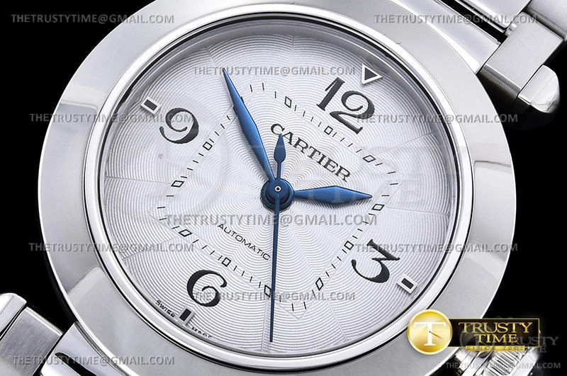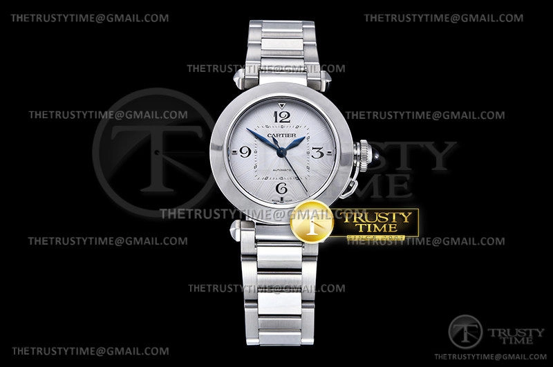 Часы Cartier из коллекции Pasha De Cartier. Классические мужские часы Cartier Pasha De Cartier 41mm WSPA0014_1040PSWA премиального качества (Артикул магазина: CR-0742) оснащены надежным автоматическим механизмом с автоподзаводом (работает от амплитуды движения руки) калибра MY9015, в котором реализованы следующие функции: часовая, минутная и секундная стрелки, а так же максимально простой функционал без усложнений. Круглый корпус часов стального цвета, имеющий размер 41 мм и высоту 9.5 мм превосходно дополнит образ и украсит запястье своего обладателя. Для изготовления часов Cartier Pasha De Cartier 41mm WSPA0014_1040PSWA предлагаемых в нашем интернет-магазине, применяются нержавеющая сталь 316F высокого качества (Швейцарский стандарт), а так же сапфировое стекло высокой прочности, благодаря чему обеспечивается максимальная защита от сколов и механических повреждений. Отличительной чертой данной модели является белый циферблат, часовые индексы которого обеспечивают арабские цифры. Завершает образ браслет из нержавеющей стали стального цвета с фирменной раскладывающейся застежкой Cartier. Водонепроницаемость данной модели составляет 30М (WR30) – допускается минимальное воздействие с водой.