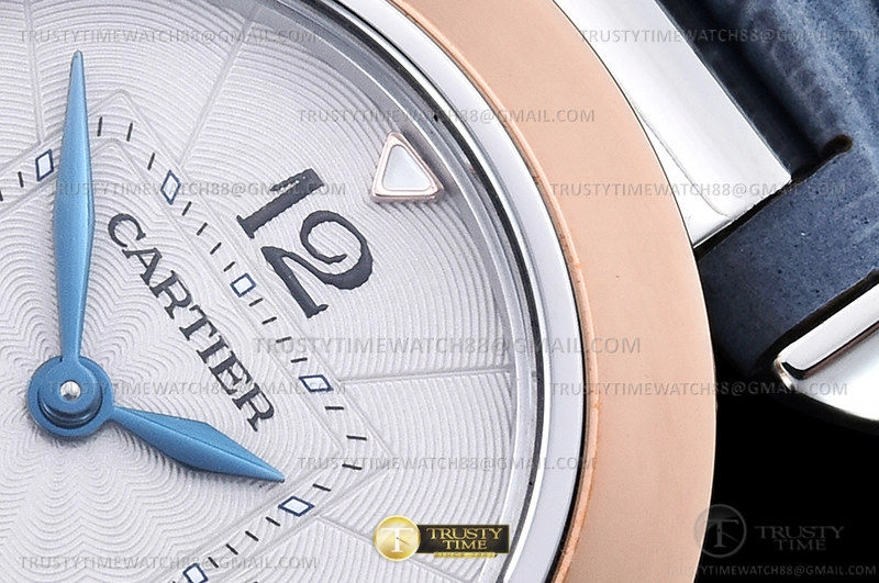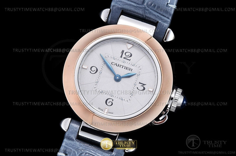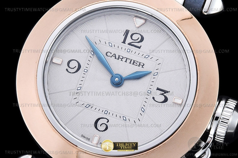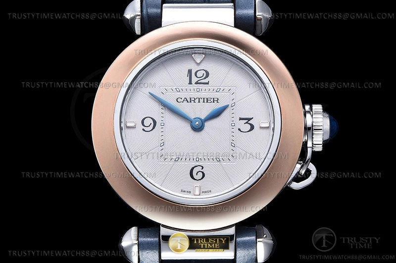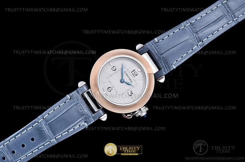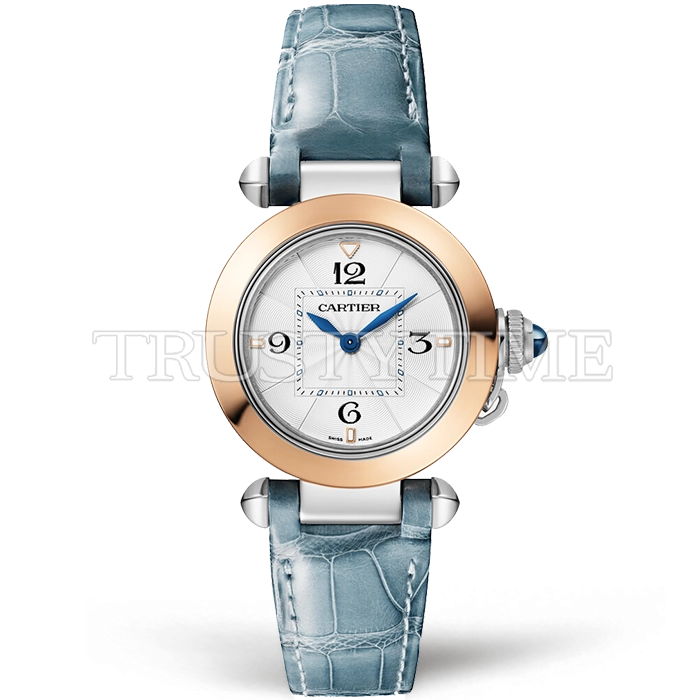 Часы Cartier из коллекции Pasha De Cartier. Классические женские часы Cartier Pasha De Cartier 30mm W2PA0007_00PW0A27 премиального качества (Артикул магазина: CR-0911) оснащены надежным кварцевым механизмом (работает от батареи) калибра Swiss Quartz ETA, в котором реализованы следующие функции: часова и минутка стрелки, а так же максимально простой функционал без усложнений. Круглый корпус часов комбинированного сталь с розового золота цвета, имеющий размер 30 мм и высоту 9 мм превосходно дополнит образ и украсит запястье своего обладателя. Для изготовления часов Cartier Pasha De Cartier 30mm W2PA0007_00PW0A27 предлагаемых в нашем интернет-магазине, применяются нержавеющая сталь 316F высокого качества (Швейцарский стандарт), а так же сапфировое стекло высокой прочности, благодаря чему обеспечивается максимальная защита от сколов и механических повреждений. Отличительной чертой данной модели является белый циферблат, часовые индексы которого обеспечивают арабские цифры, часовые индексы которого обеспечивают часовые метки. Завершает образ кожаный ремешок голубого цвета с фирменной раскладывающейся застежкой Cartier. Водонепроницаемость данной модели составляет 30М (WR30) – допускается минимальное воздействие с водой.