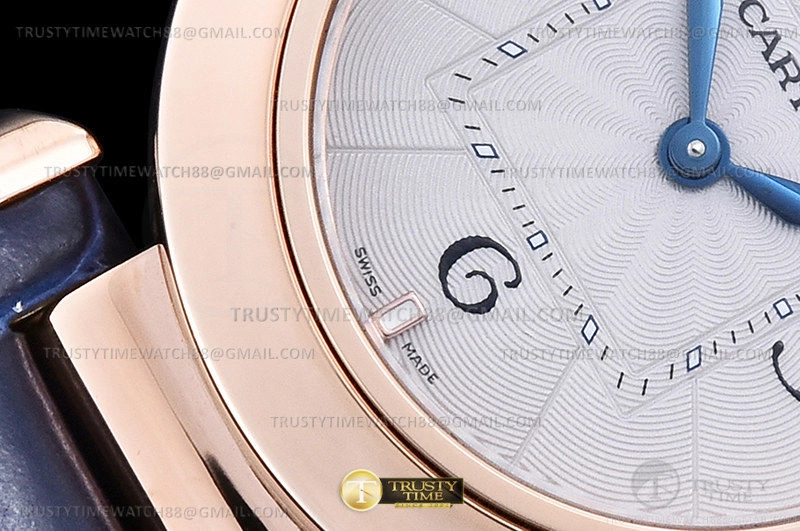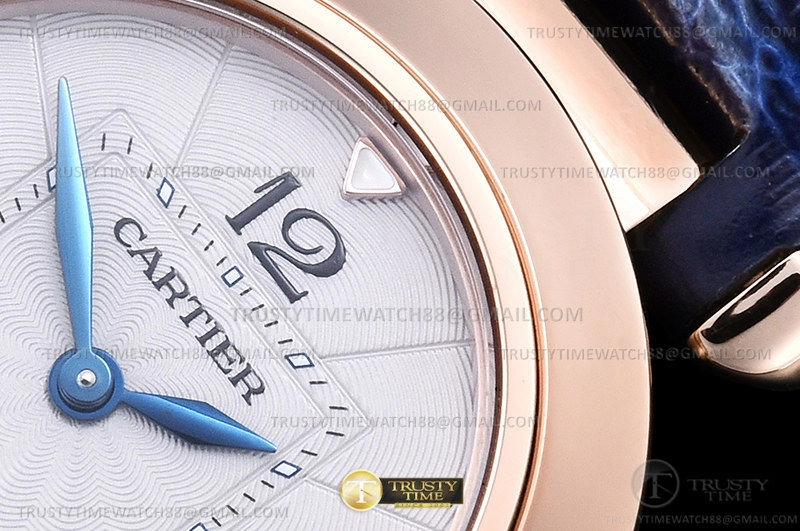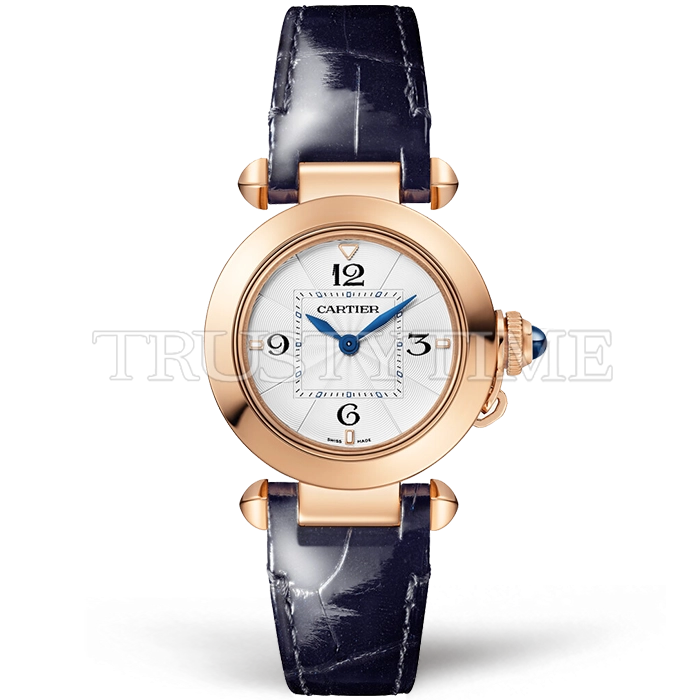 Часы Cartier из коллекции Pasha De Cartier. Классические женские часы Cartier Pasha De Cartier 30mm WGPA0018_GAW1P800 премиального качества (Артикул магазина: CR-0909) оснащены надежным кварцевым механизмом (работает от батареи) калибра Swiss Quartz ETA, в котором реализованы следующие функции: часова и минутка стрелки, а так же максимально простой функционал без усложнений. Круглый корпус часов розового цвета, имеющий размер 30 мм и высоту 9 мм превосходно дополнит образ и украсит запястье своего обладателя. Для изготовления часов Cartier Pasha De Cartier 30mm WGPA0018_GAW1P800 предлагаемых в нашем интернет-магазине, применяются нержавеющая сталь 316F высокого качества (Швейцарский стандарт), а так же сапфировое стекло высокой прочности, благодаря чему обеспечивается максимальная защита от сколов и механических повреждений. Отличительной чертой данной модели является белый циферблат, часовые индексы которого обеспечивают арабские цифры, часовые индексы которого обеспечивают часовые метки. Завершает образ кожаный ремешок синего цвета с фирменной раскладывающейся застежкой Cartier. Водонепроницаемость данной модели составляет 30М (WR30) – допускается минимальное воздействие с водой.
