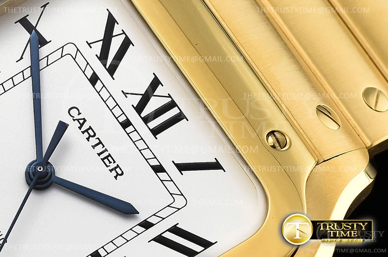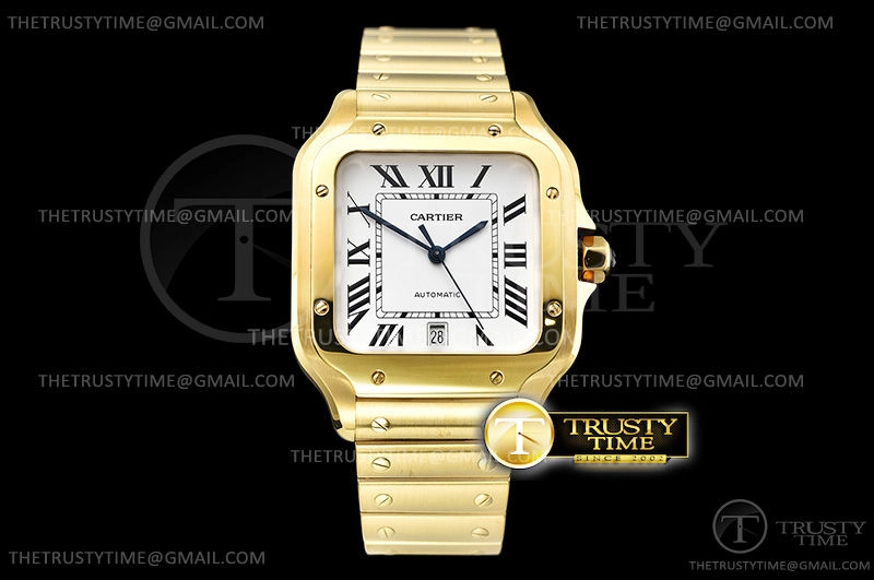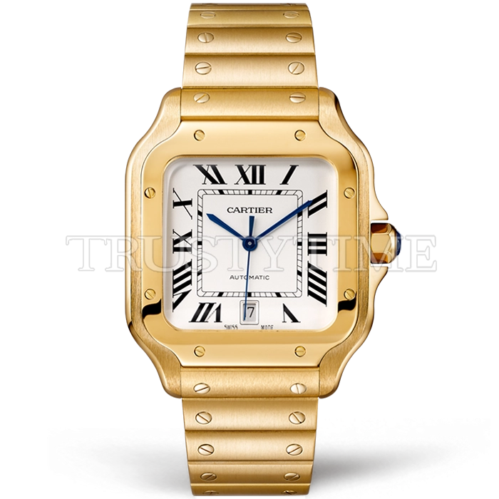 Часы Cartier из коллекции Santos De Cartier. Классические мужские часы Cartier Santos De Cartier 40 WGSA0009 премиального качества (Артикул магазина: CR-0683) оснащены надежным автоматическим механизмом с автоподзаводом (работает от амплитуды движения руки) калибра MY9015, в котором реализованы следующие функции: часовая, минутная и секундная стрелки, а так же дата. Квадратный корпус часов цветы желтой золота, имеющий размер 40 мм X 47.5 мм и высоту 9 мм превосходно дополнит образ и украсит запястье своего обладателя. Для изготовления часов Cartier Santos De Cartier 40 WGSA0009 предлагаемых в нашем интернет-магазине, применяются нержавеющая сталь 316F высокого качества (Швейцарский стандарт), а так же сапфировое стекло высокой прочности, благодаря чему обеспечивается максимальная защита от сколов и механических повреждений. Отличительной чертой данной модели является белый циферблат, часовые индексы которого обеспечивают римские цифры. Завершает образ браслет из нержавеющей стали цвета желтого золота с фирменной раскладывающейся застежкой Cartier. Водонепроницаемость данной модели составляет 30М (WR30) – допускается минимальное воздействие с водой.