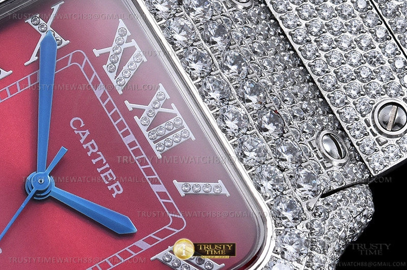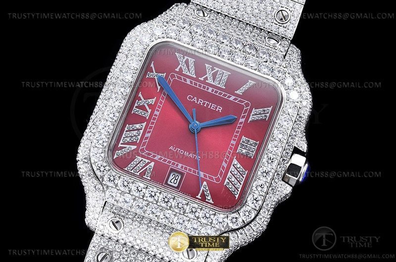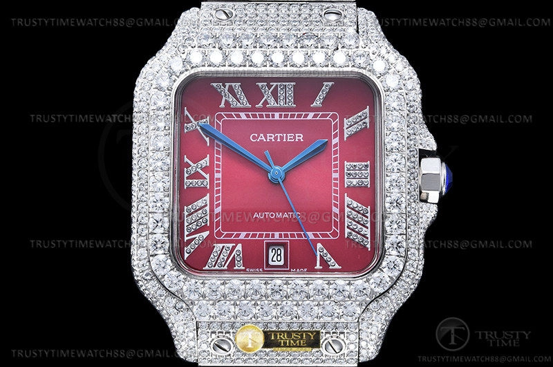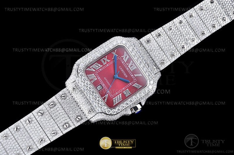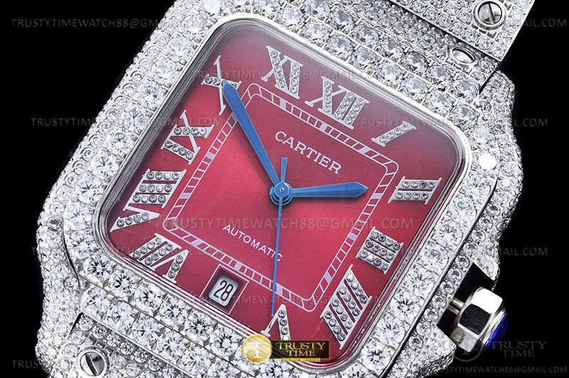 Часы Cartier из коллекции Santos De Cartier. Классические мужские часы Cartier Santos De Cartier 40 WSSA0018 Diamonds премиального качества (Артикул магазина: CR-0931) оснащены надежным автоматическим механизмом с автоподзаводом (работает от амплитуды движения руки) калибра MY8215, в котором реализованы следующие функции: часовая, минутная и секундная стрелки, а так же дата. Квадратный корпус часов стального цвета, имеющий размер 40 мм и высоту 12 мм превосходно дополнит образ и украсит запястье своего обладателя. Для изготовления часов Cartier Santos De Cartier 40 WSSA0018 Diamonds предлагаемых в нашем интернет-магазине, применяются нержавеющая сталь 316L высокого качества (Швейцарский стандарт), а так же сапфировое стекло высокой прочности, благодаря чему обеспечивается максимальная защита от сколов и механических повреждений. Отличительной чертой данной модели является красный циферблат, часовые индексы которого обеспечивают римские цифры. Завершает образ браслет из нержавеющей стали стального цвета с фирменной раскладывающейся застежкой Cartier. Водонепроницаемость данной модели составляет 30М (WR30) – допускается минимальное воздействие с водой.