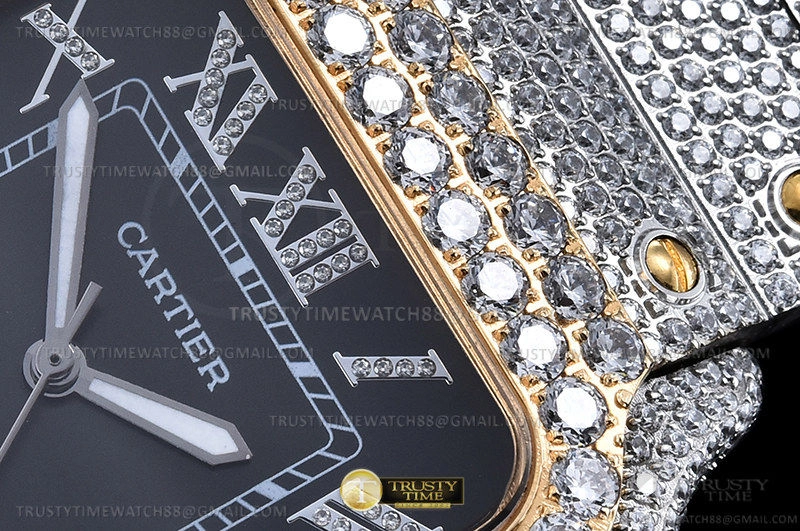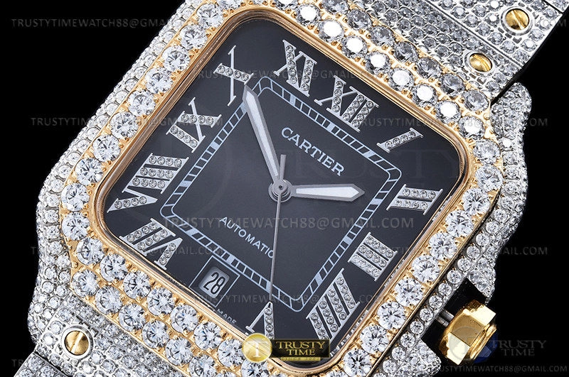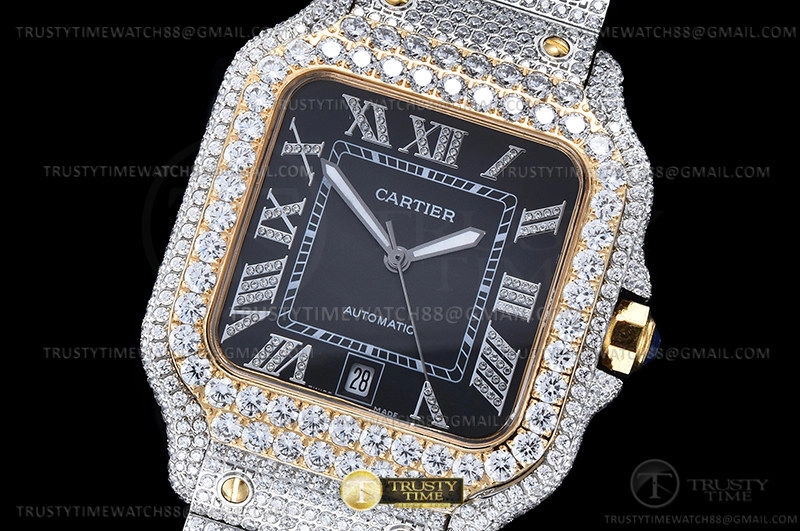 Часы Cartier из коллекции Santos De Cartier. Классические мужские часы Cartier Santos De Cartier 40 W2SA0009 Diamonds премиального качества (Артикул магазина: CR-0937) оснащены надежным автоматическим механизмом с автоподзаводом (работает от амплитуды движения руки) калибра MY8215, в котором реализованы следующие функции: часовая, минутная и секундная стрелки, а так же дата. Квадратный корпус часов комбинированного сталь с желтого золота цвета, имеющий размер 40 мм и высоту 12 мм превосходно дополнит образ и украсит запястье своего обладателя. Для изготовления часов Cartier Santos De Cartier 40 W2SA0009 Diamonds предлагаемых в нашем интернет-магазине, применяются нержавеющая сталь 316L высокого качества (Швейцарский стандарт), а так же сапфировое стекло высокой прочности, благодаря чему обеспечивается максимальная защита от сколов и механических повреждений. Отличительной чертой данной модели является черный циферблат, часовые индексы которого обеспечивают римские цифры. Завершает образ браслет из нержавеющей стали комбинированного сталь с желтым золотом цвета с фирменной раскладывающейся застежкой Cartier. Водонепроницаемость данной модели составляет 30М (WR30) – допускается минимальное воздействие с водой.