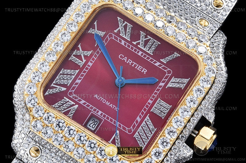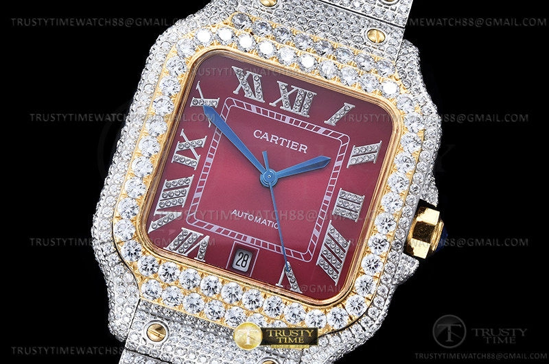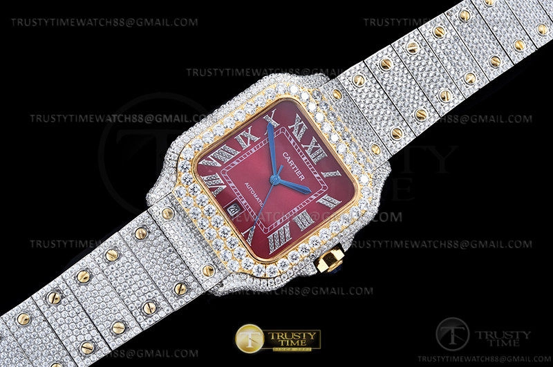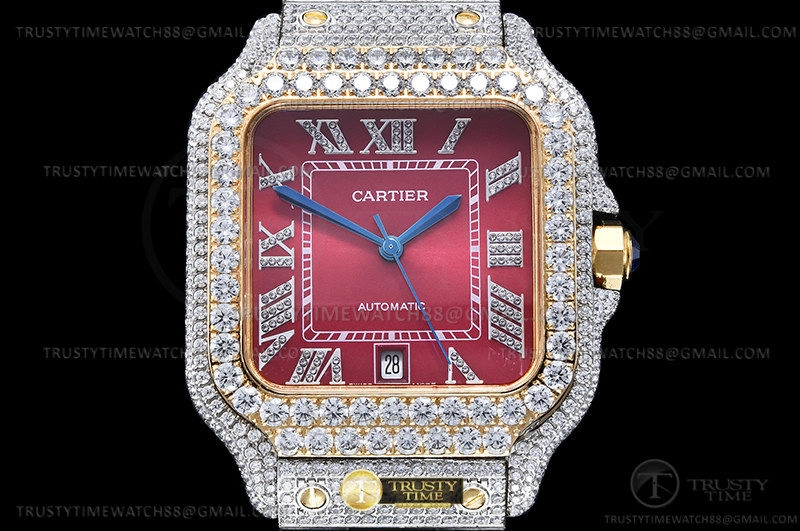 Часы Cartier из коллекции Santos De Cartier. Классические мужские часы Cartier Santos De Cartier 40 W2SA0009 Diamonds премиального качества (Артикул магазина: CR-0938) оснащены надежным автоматическим механизмом с автоподзаводом (работает от амплитуды движения руки) калибра MY8215, в котором реализованы следующие функции: часовая, минутная и секундная стрелки, а так же дата. Квадратный корпус часов комбинированного сталь с желтого золота цвета, имеющий размер 40 мм и высоту 12 мм превосходно дополнит образ и украсит запястье своего обладателя. Для изготовления часов Cartier Santos De Cartier 40 W2SA0009 Diamonds предлагаемых в нашем интернет-магазине, применяются нержавеющая сталь 316L высокого качества (Швейцарский стандарт), а так же сапфировое стекло высокой прочности, благодаря чему обеспечивается максимальная защита от сколов и механических повреждений. Отличительной чертой данной модели является красный циферблат, часовые индексы которого обеспечивают римские цифры. Завершает образ браслет из нержавеющей стали комбинированного сталь с желтым золотом цвета с фирменной раскладывающейся застежкой Cartier. Водонепроницаемость данной модели составляет 30М (WR30) – допускается минимальное воздействие с водой.