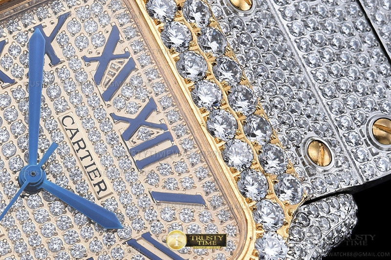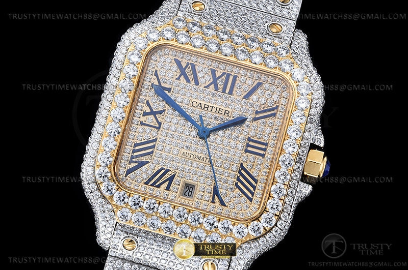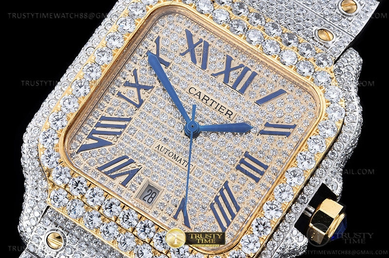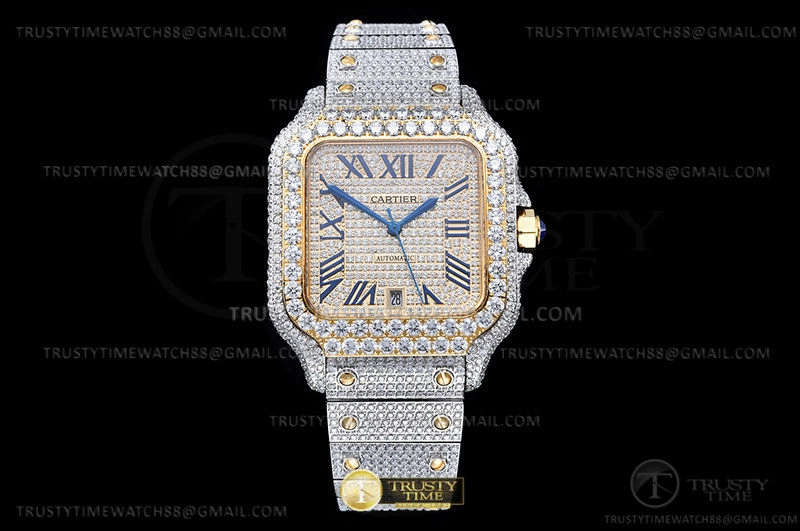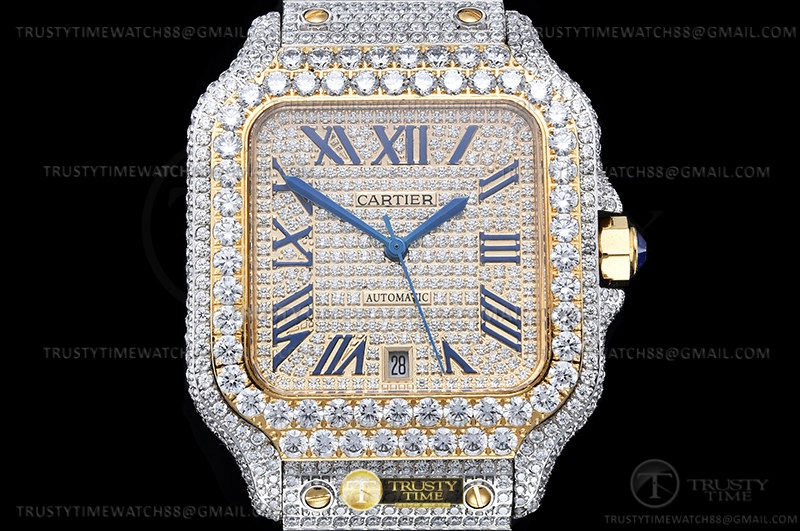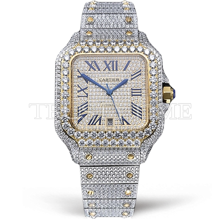 Часы Cartier из коллекции Santos De Cartier. Классические мужские часы Cartier Santos De Cartier 40 W2SA0009 Diamonds премиального качества (Артикул магазина: CR-0940) оснащены надежным автоматическим механизмом с автоподзаводом (работает от амплитуды движения руки) калибра MY8215, в котором реализованы следующие функции: часовая, минутная и секундная стрелки, а так же дата. Квадратный корпус часов комбинированного сталь с желтого золота цвета, имеющий размер 40 мм и высоту 12 мм превосходно дополнит образ и украсит запястье своего обладателя. Для изготовления часов Cartier Santos De Cartier 40 W2SA0009 Diamonds предлагаемых в нашем интернет-магазине, применяются нержавеющая сталь 316L высокого качества (Швейцарский стандарт), а так же сапфировое стекло высокой прочности, благодаря чему обеспечивается максимальная защита от сколов и механических повреждений. Отличительной чертой данной модели является золотой циферблат, часовые индексы которого обеспечивают римские цифры. Завершает образ браслет из нержавеющей стали комбинированного сталь с желтым золотом цвета с фирменной раскладывающейся застежкой Cartier. Водонепроницаемость данной модели составляет 30М (WR30) – допускается минимальное воздействие с водой.