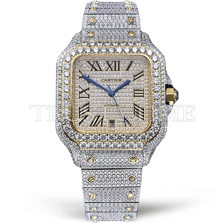 Часы Cartier из коллекции Santos De Cartier. Классические мужские часы Cartier Santos De Cartier 40 W2SA0009 Diamonds премиального качества (Артикул магазина: CR-0941) оснащены надежным автоматическим механизмом с автоподзаводом (работает от амплитуды движения руки) калибра MY8215, в котором реализованы следующие функции: часовая, минутная и секундная стрелки, а так же дата. Квадратный корпус часов комбинированного сталь с желтого золота цвета, имеющий размер 40 мм и высоту 12 мм превосходно дополнит образ и украсит запястье своего обладателя. Для изготовления часов Cartier Santos De Cartier 40 W2SA0009 Diamonds предлагаемых в нашем интернет-магазине, применяются нержавеющая сталь 316L высокого качества (Швейцарский стандарт), а так же сапфировое стекло высокой прочности, благодаря чему обеспечивается максимальная защита от сколов и механических повреждений. Отличительной чертой данной модели является золотой циферблат, часовые индексы которого обеспечивают римские цифры. Завершает образ браслет из нержавеющей стали комбинированного сталь с желтым золотом цвета с фирменной раскладывающейся застежкой Cartier. Водонепроницаемость данной модели составляет 30М (WR30) – допускается минимальное воздействие с водой.
