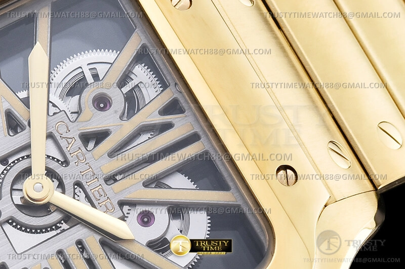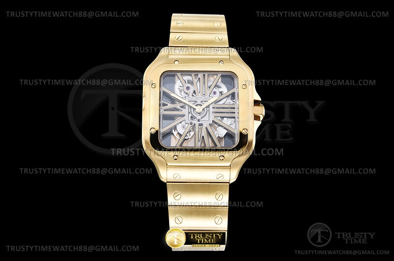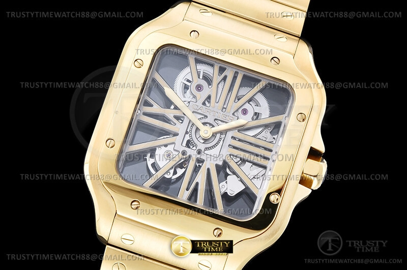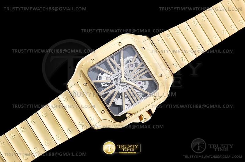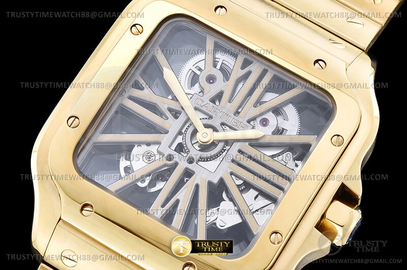 Часы Cartier из коллекции Santos De Cartier. Классические мужские часы Cartier Santos de Cartier Large Skeleton 40mm WHSA0042 премиального качества (Артикул магазина: CR-0990) оснащены надежным автоматическим механизмом с ручным заводом калибра 9611 MC, в котором реализованы следующие функции: часова и минутка стрелки, а так же максимально простой функционал без усложнений. Квадратный корпус часов цветы желтой золота, имеющий размер 40 мм и высоту 10 мм превосходно дополнит образ и украсит запястье своего обладателя. Для изготовления часов Cartier Santos de Cartier Large Skeleton 40mm WHSA0042 предлагаемых в нашем интернет-магазине, применяются нержавеющая сталь 316F высокого качества (Швейцарский стандарт), а так же сапфировое стекло высокой прочности, благодаря чему обеспечивается максимальная защита от сколов и механических повреждений. Отличительной чертой данной модели является скелетонизированный циферблат, часовые индексы которого обеспечивают римские цифры. Завершает образ браслет из нержавеющей стали цвета желтого золота с фирменной раскладывающейся застежкой Cartier. Водонепроницаемость данной модели составляет 30М (WR30) – допускается минимальное воздействие с водой.