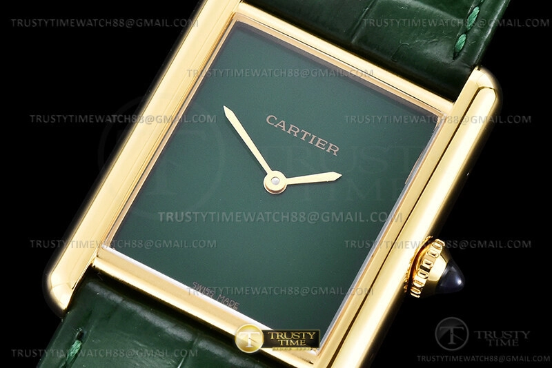 Часы Cartier из коллекции Tank Louis Watch. Классические мужские часы Cartier Tank Louis Watch WGTA0191 премиального качества (Артикул магазина: CR-0971) оснащены надежным кварцевым механизмом (работает от батареи) калибра Swiss Quartz ETA, в котором реализованы следующие функции: часова и минутка стрелки, а так же максимально простой функционал без усложнений. Прямоугольный корпус часов цветы желтой золота, имеющий размер 33.7 мм x 25.5 мм и высоту 6.7 мм превосходно дополнит образ и украсит запястье своего обладателя. Для изготовления часов Cartier Tank Louis Watch WGTA0191 предлагаемых в нашем интернет-магазине, применяются нержавеющая сталь 316L высокого качества (Швейцарский стандарт), а так же сапфировое стекло высокой прочности, благодаря чему обеспечивается максимальная защита от сколов и механических повреждений. Отличительной чертой данной модели является зеленый циферблат, без меток и цифр. Завершает образ кожаный ремешок зеленого цвета с фирменной классической застежкой Cartier. Водонепроницаемость данной модели составляет 30М (WR30) – допускается минимальное воздействие с водой.