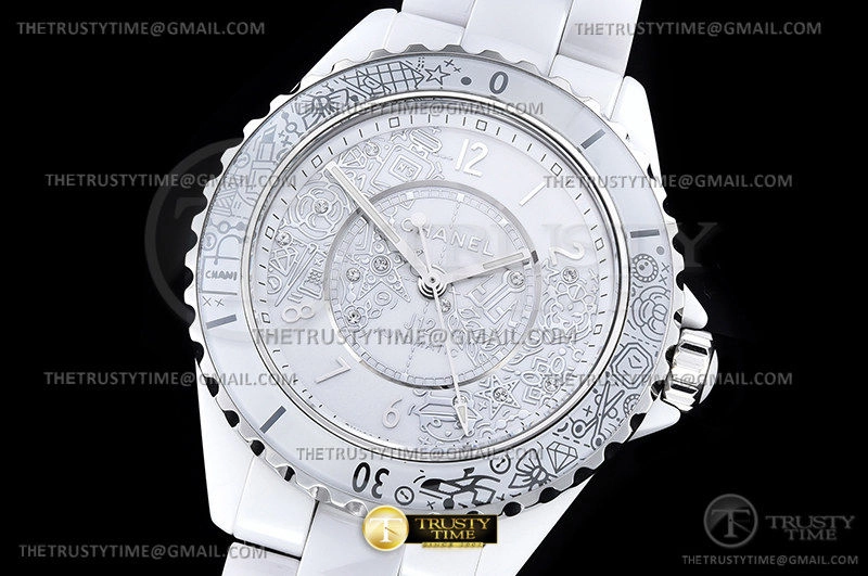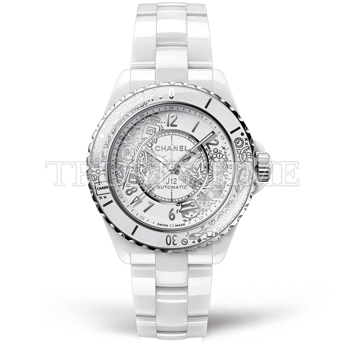 Часы Chanel из коллекции J-12. Классические женские часы Chanel J-12-20 38 H6476 премиального качества (Артикул магазина: CN-0244) оснащены надежным автоматическим механизмом с автоподзаводом (работает от амплитуды движения руки) калибра 12.1, в котором реализованы следующие функции: часовая, минутная и секундная стрелки, а так же максимально простой функционал без усложнений. Круглый корпус часов белого цвета, имеющий размер 38 мм и высоту 12.7 мм превосходно дополнит образ и украсит запястье своего обладателя. Для изготовления часов Chanel J-12-20 38 H6476 предлагаемых в нашем интернет-магазине, применяются керамика высокого качества (Швейцарский стандарт), а так же сапфировое стекло высокой прочности, благодаря чему обеспечивается максимальная защита от сколов и механических повреждений. Отличительной чертой данной модели является белый циферблат, часовые индексы которого обеспечивают арабские цифры. Завершает образ керамический браслет белого цвета с фирменной раскладывающейся застежкой Chanel. Водонепроницаемость данной модели составляет 30М (WR30) – допускается минимальное воздействие с водой.
