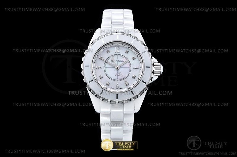 Часы Chanel из коллекции J-12. Классические женские часы Chanel J-12 33 H2422 премиального качества (Артикул магазина: CN-0250) оснащены надежным кварцевым механизмом (работает от батареи) калибра ETA.956.612, в котором реализованы следующие функции: часовая, минутная и секундная стрелки, а так же максимально простой функционал без усложнений. Круглый корпус часов белого цвета, имеющий размер 33 мм и высоту 11 мм превосходно дополнит образ и украсит запястье своего обладателя. Для изготовления часов Chanel J-12 33 H2422 предлагаемых в нашем интернет-магазине, применяются керамика высокого качества (Швейцарский стандарт), а так же сапфировое стекло высокой прочности, благодаря чему обеспечивается максимальная защита от сколов и механических повреждений. Отличительной чертой данной модели является перламутровый циферблат, часовые индексы которого обеспечивают камни. Завершает образ керамический браслет белого цвета с фирменной раскладывающейся застежкой Chanel. Водонепроницаемость данной модели составляет 30М (WR30) – допускается минимальное воздействие с водой.