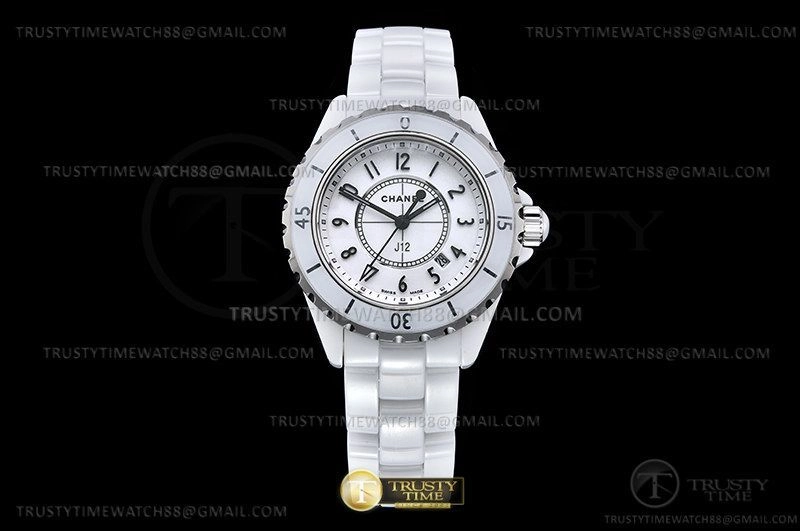 Часы Chanel из коллекции J-12. Классические женские часы Chanel J-12 33 H0968 премиального качества (Артикул магазина: CN-0253) оснащены надежным кварцевым механизмом (работает от батареи) калибра ETA.956.612, в котором реализованы следующие функции: часовая, минутная и секундная стрелки, а так же дата. Круглый корпус часов белого цвета, имеющий размер 33 мм и высоту 11 мм превосходно дополнит образ и украсит запястье своего обладателя. Для изготовления часов Chanel J-12 33 H0968 предлагаемых в нашем интернет-магазине, применяются керамика высокого качества (Швейцарский стандарт), а так же сапфировое стекло высокой прочности, благодаря чему обеспечивается максимальная защита от сколов и механических повреждений. Отличительной чертой данной модели является белый циферблат, часовые индексы которого обеспечивают арабские цифры. Завершает образ керамический браслет белого цвета с фирменной раскладывающейся застежкой Chanel. Водонепроницаемость данной модели составляет 30М (WR30) – допускается минимальное воздействие с водой.